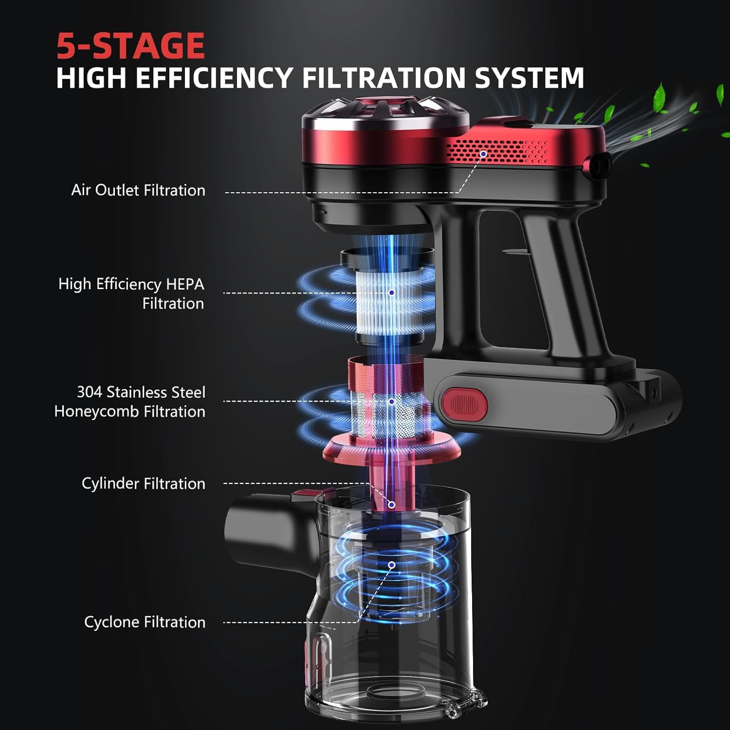 - EFFICIENT FILTRATION SYSTEM: This cordless vacuum cleaner is equipped with a 5-stage advanced filtration system, which can efficiently absorb 99.99% of dust particles to ensure cleaner air at home. The large-capacity dust cup meets a variety of cleaning needs, and the one-button emptying dust cup design avoids contact with dust and makes cleaning more hygienic.