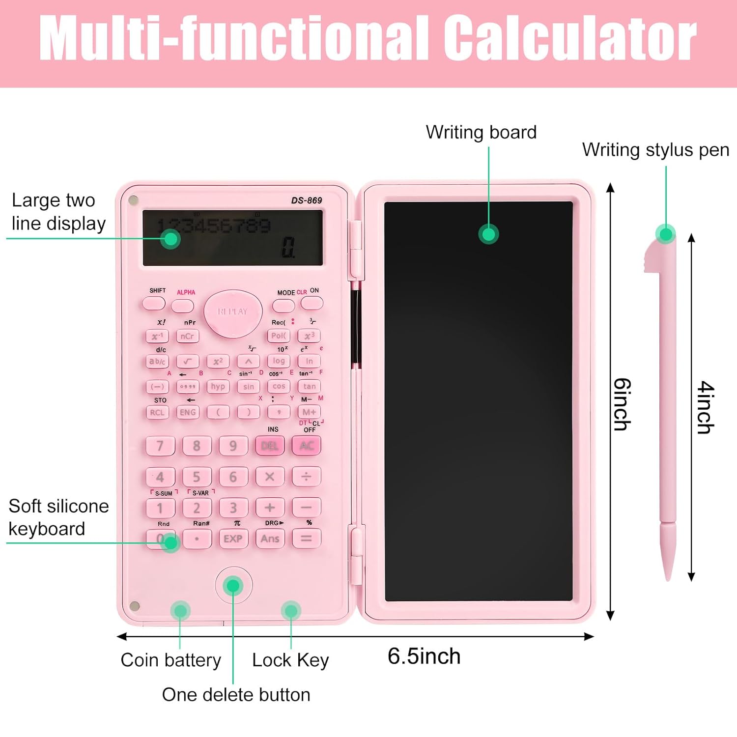 About Scientific Calculator with LCD Writing Tablet Notepad, 240 Functions Foldable Math Calculator, Dual-Line 10+2 Digit Large Display, Portable for High School College Office(Pink)