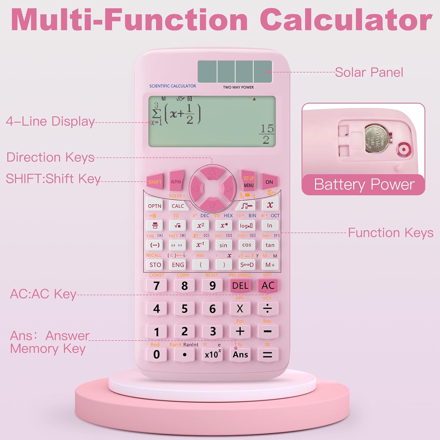 Specification: Scientific Calculators,Rudnia Pink Solar Calculators with 4-line Display,10+2 Digits and 552 Function Calculator,School Supplies for Middle High School and College Students (Pink) by Rudnia