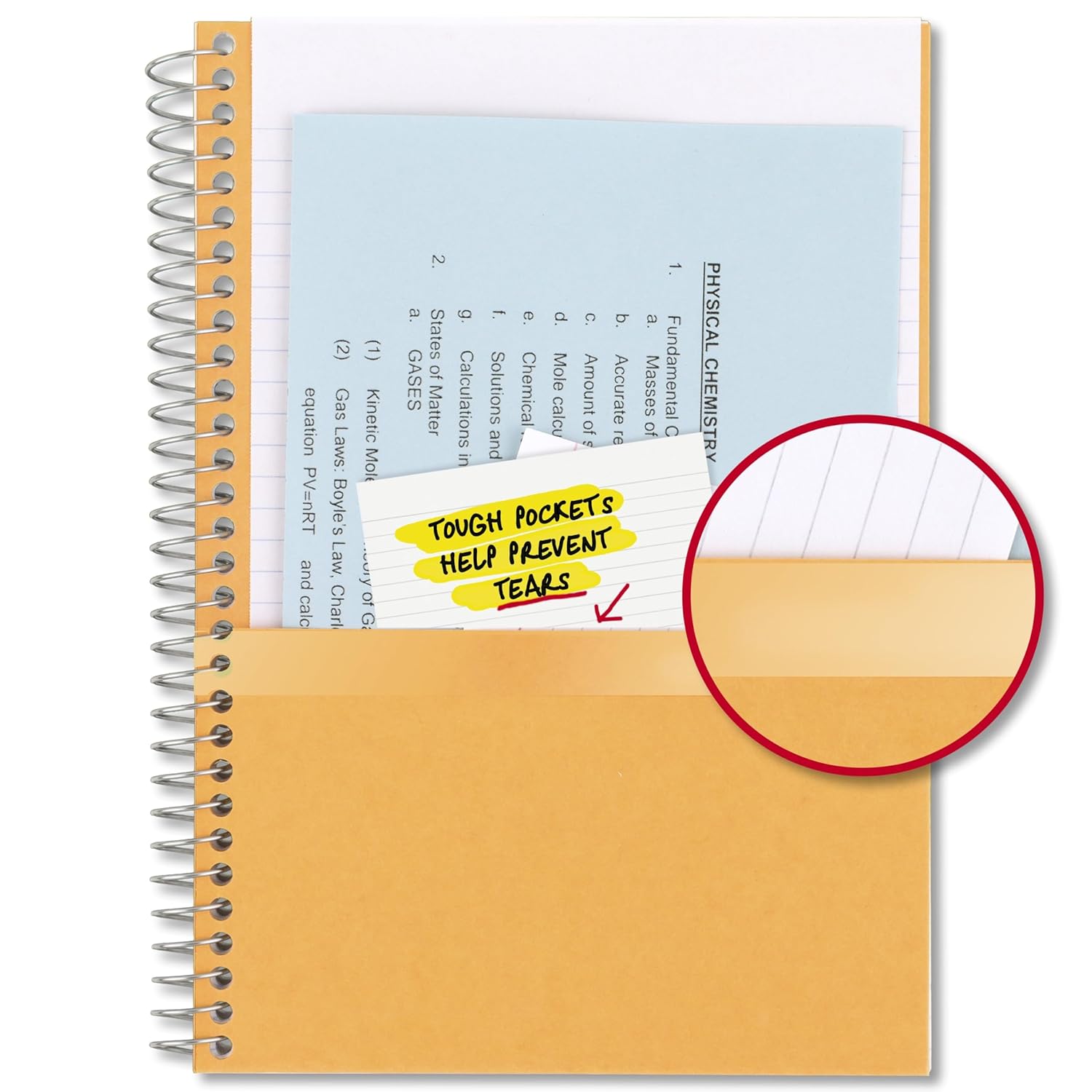 - Tough pockets help prevent tears and hold 6″ x 9-1/2″ loose sheets and notes. Durable plastic water-resistant front cover helps protect your notes and our Spiral Lock wire helps prevent snags on clothes and backpacks.