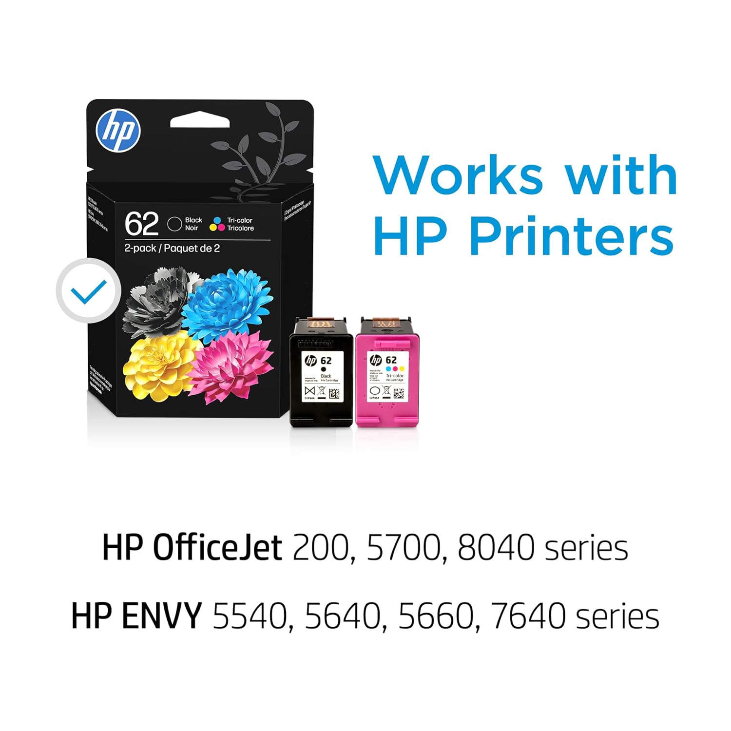 Specification: HP 62 Black/Tri-color Ink Cartridges for HP Printers (2-pack) | Works with Printer Series: ENVY 5540, 5640, 5660, 7640, OfficeJet 5740, 8040, OfficeJet Mobile 200, 250 | N9H64FN by HP