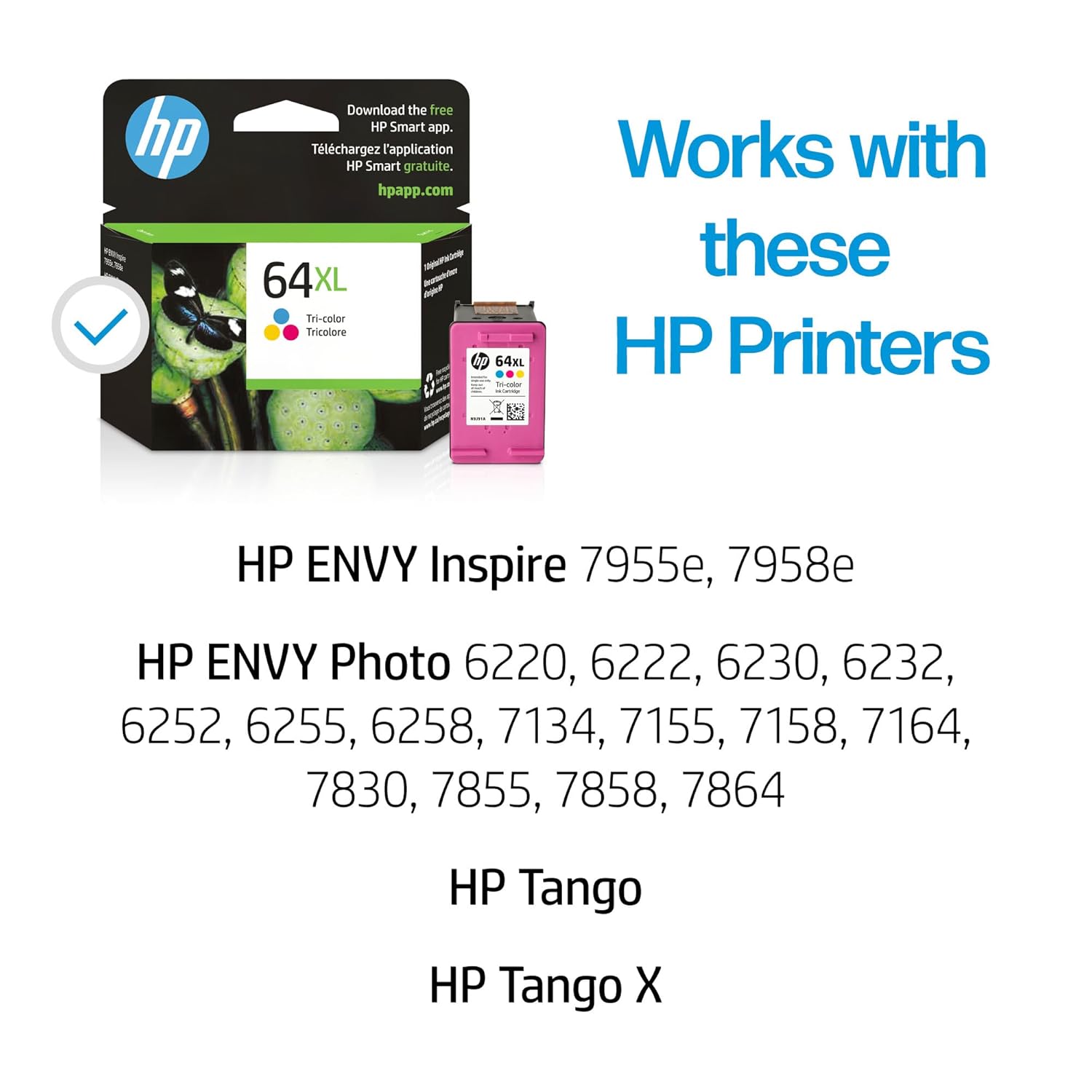 Specification: HP 64XL Tri-color High-yield Ink Cartridge for HP Printers | Works with Printer Series: ENVY Inspire 7950e; ENVY Photo 6200, 7100, 7800; Tango | Eligible for Instant Ink | N9J91AN by HP