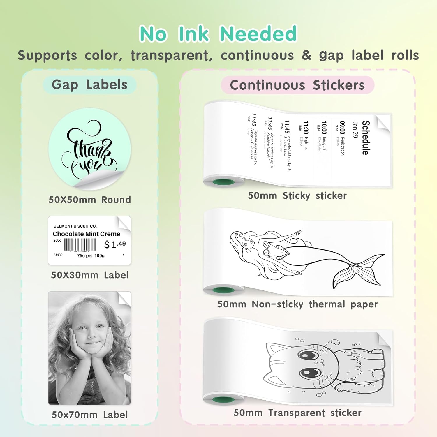 - Ink-Free Thermal Printing Technology – Enjoy clean, cost-effective printing with advanced thermal technology—no ink, toner, or ribbons required. This upgraded version is compatible with both continuous and gap labels, as well as sticky or non-sticky paper. It also supports multiple roll types, including standard white, colored, and transparent sticker paper (2-inch width).