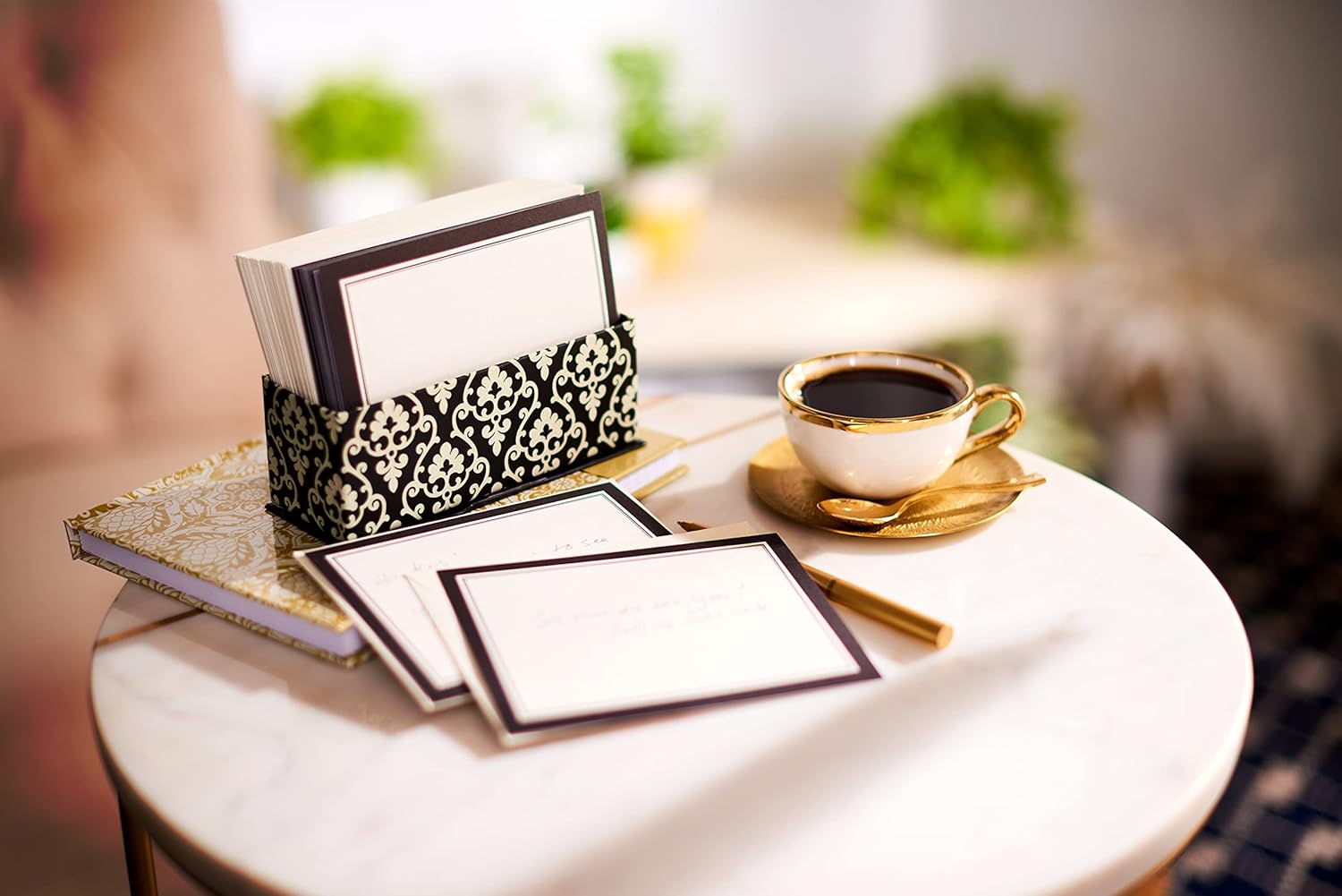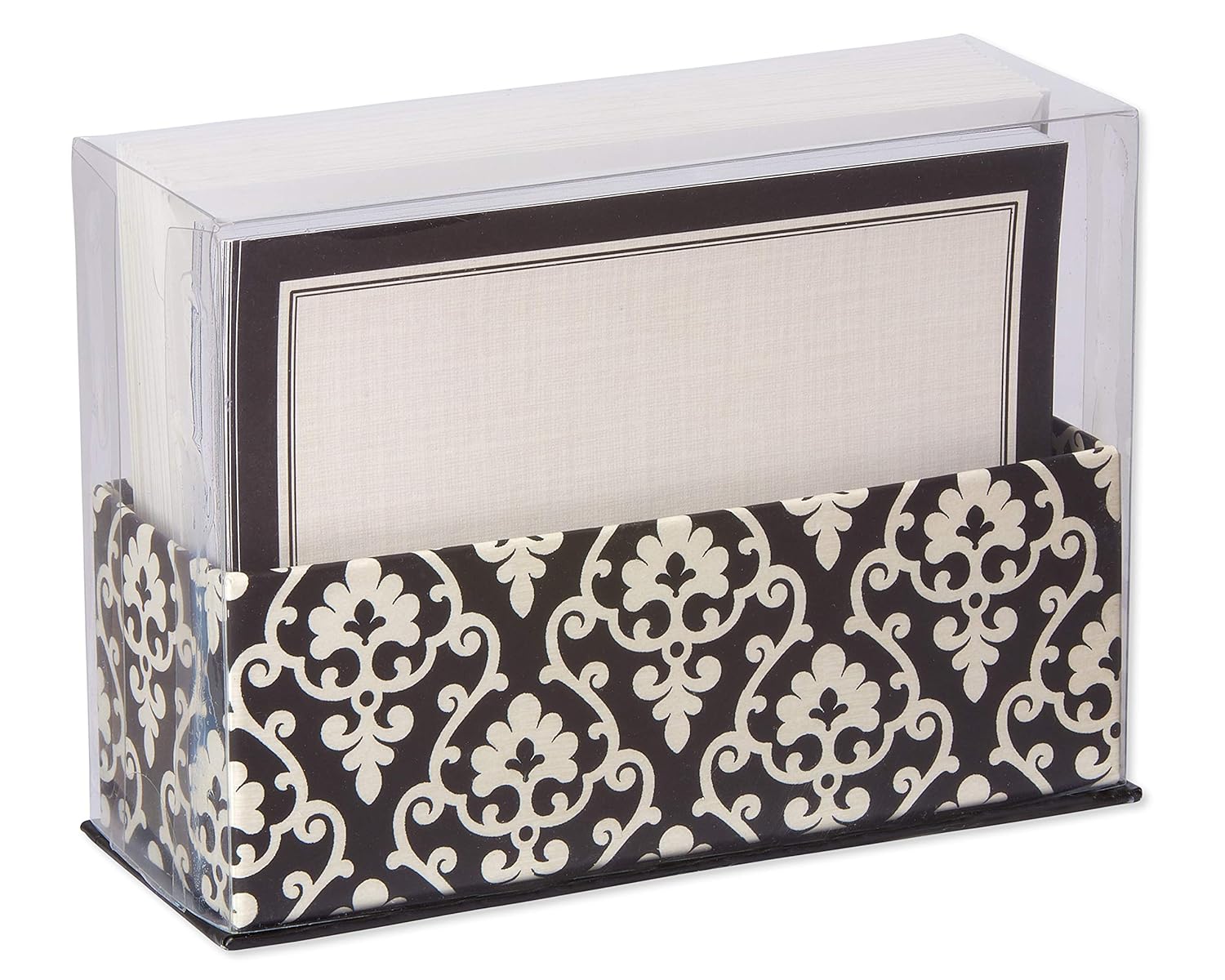- This blank card collection features a stylish, sturdy black box decorated in a white damask pattern with coordinating cards and envelopes. This matte paper stock works well with any type of pen or pencil!