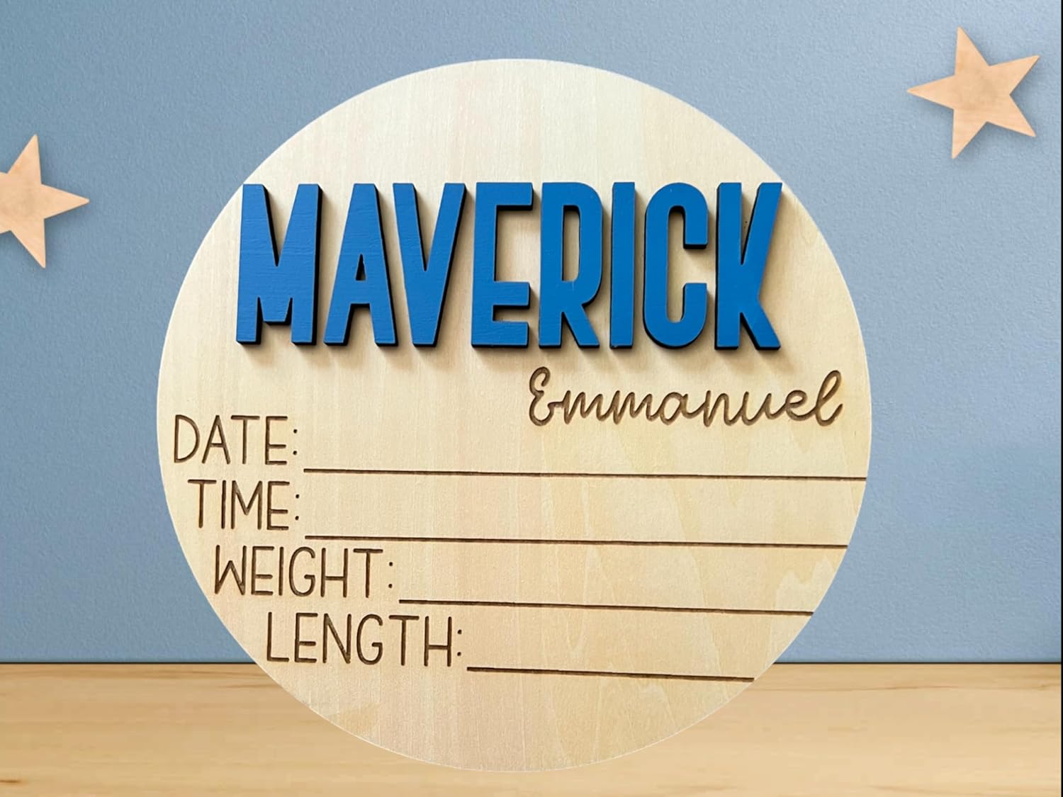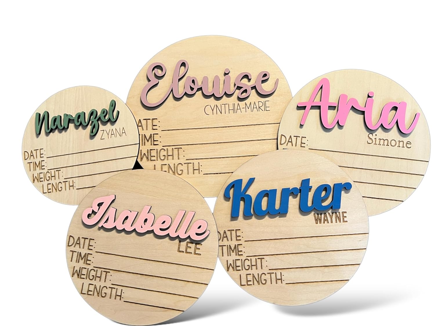 - Choose between 25 Font Combinations and 30 colors for the first name. Made in our Florida shop, we use high quality birch 1/8″ that is laser engraved and cut. The wood is unfinished so you can add your baby stats.