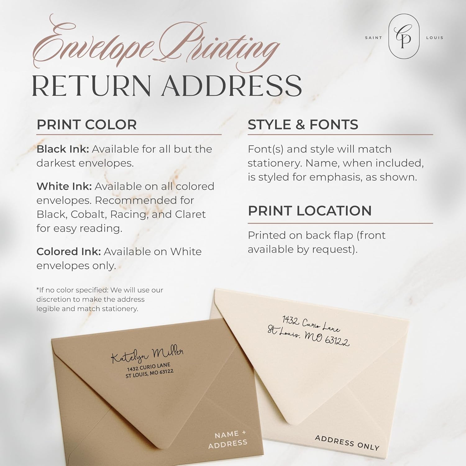 - FLEXIBLE OPTIONS: Choose add-ons like increasing the notecard and envelope quantity, enlarging card size from standard A2 to A7 (5 x 7 in), and your printing return address on the envelope flaps. Our flexible options are perfect for any woman’s style and are ideal for a cohesive and elegant custom stationery note cards and envelopes set.