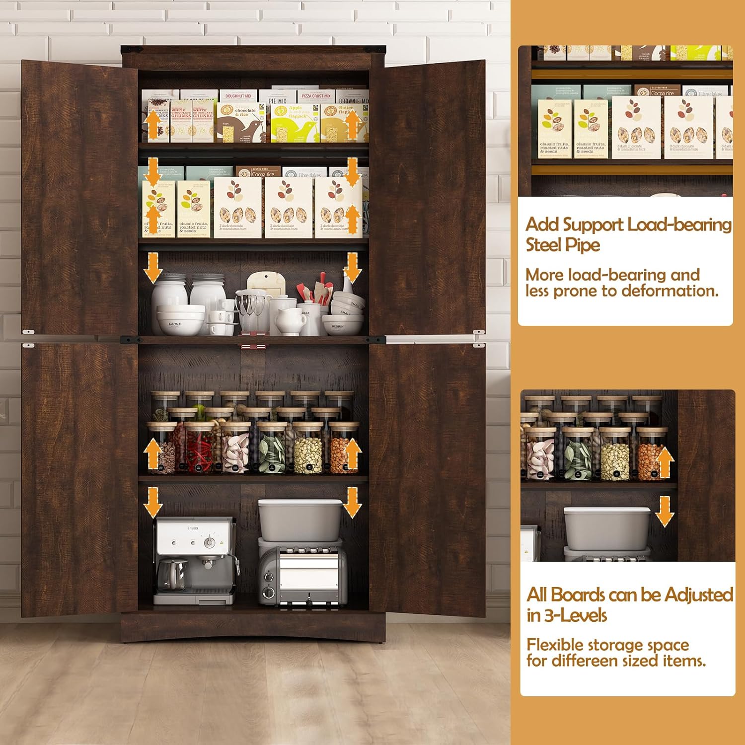 Top Pick โ discover the 71″ Tall Kitchen Pantry,Farmhouse Storage Cabinet with Adjustable Shelves,Load-Bearing Steel Pipe,Farmhouse Pantry Cabinet with 4 Barn Doors, for Kitchen,Dining Room,Living… by Hlivelood, built for performance and designed for life in the United States.
