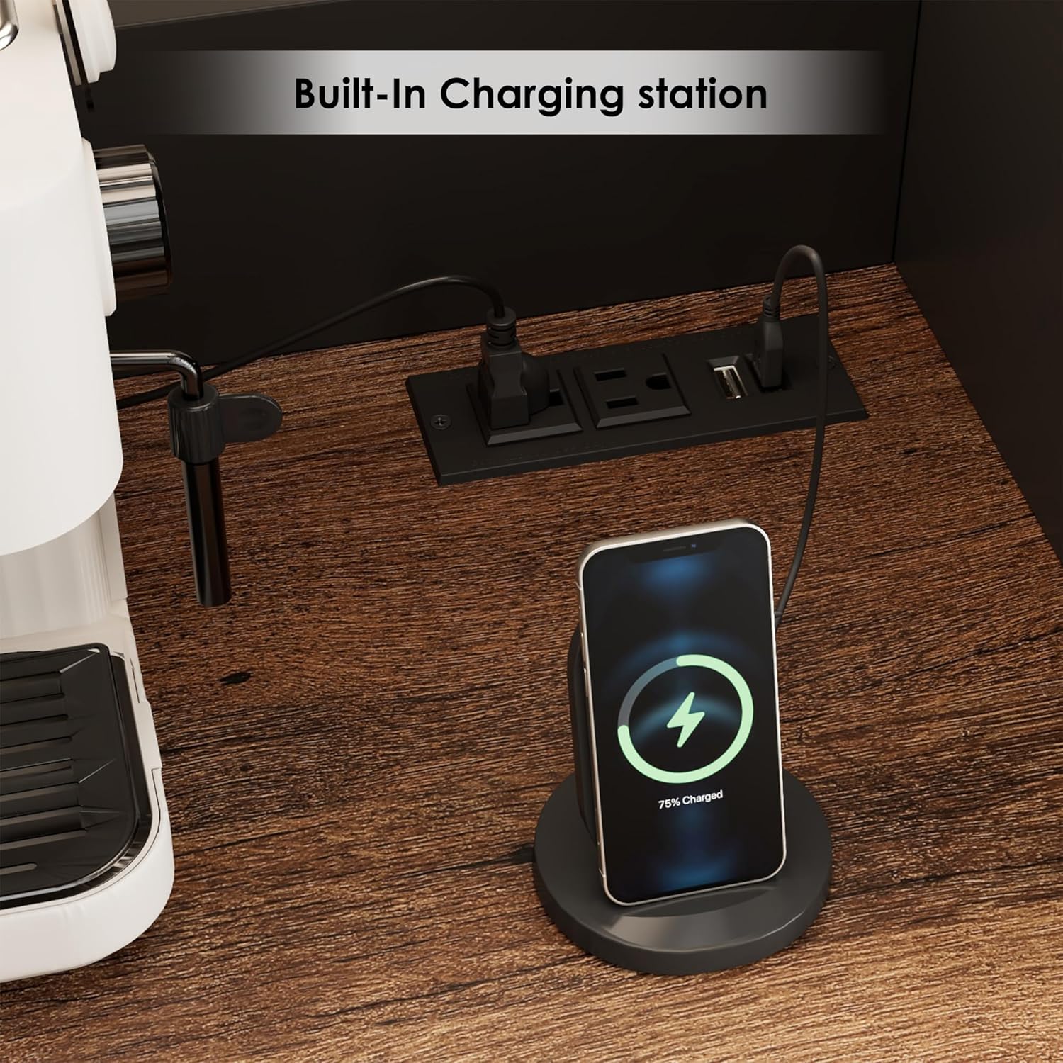 Power + LEDs — The RGB LED strip is a fun touch and surprisingly versatile. The built-in outlet and USB ports on the middle shelf are super convenient for plugging in our coffee maker or charging phones.