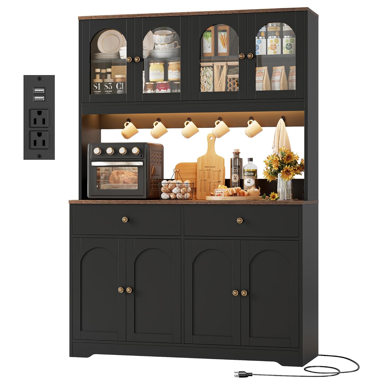 - FARMHOUSE STYLE PANTRY CABINET: This classic black cabinet is beautifully adorned with arched doors and gold metal handles, complemented by a rustic brown top, seamlessly blending modern elegance with vintage charm. Its timeless design adds a touch of sophistication to your home decor. Exceptionally versatile, it can effortlessly serve as a coffee hutch, bar cabinet, food pantry, china cabinet, or buffet sideboard, making it the perfect addition to your living room, kitchen and dining room