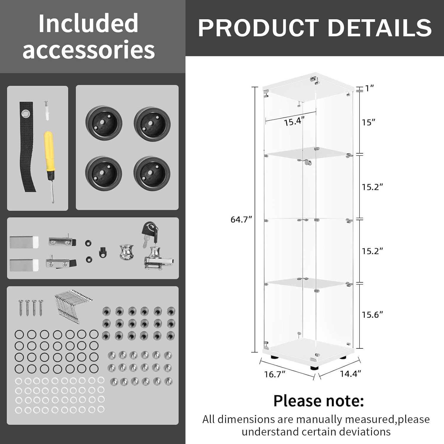 - Fast Installation in 30 Mins: This glass cabinet has been optimized and upgraded on the basis of classic styles, with accessory packs and instructions, making it easier to assemble. The anti-overturning device can better fix the glass display case. You can easily store your belongings in this beautiful glass display case and keep it tidy and safe