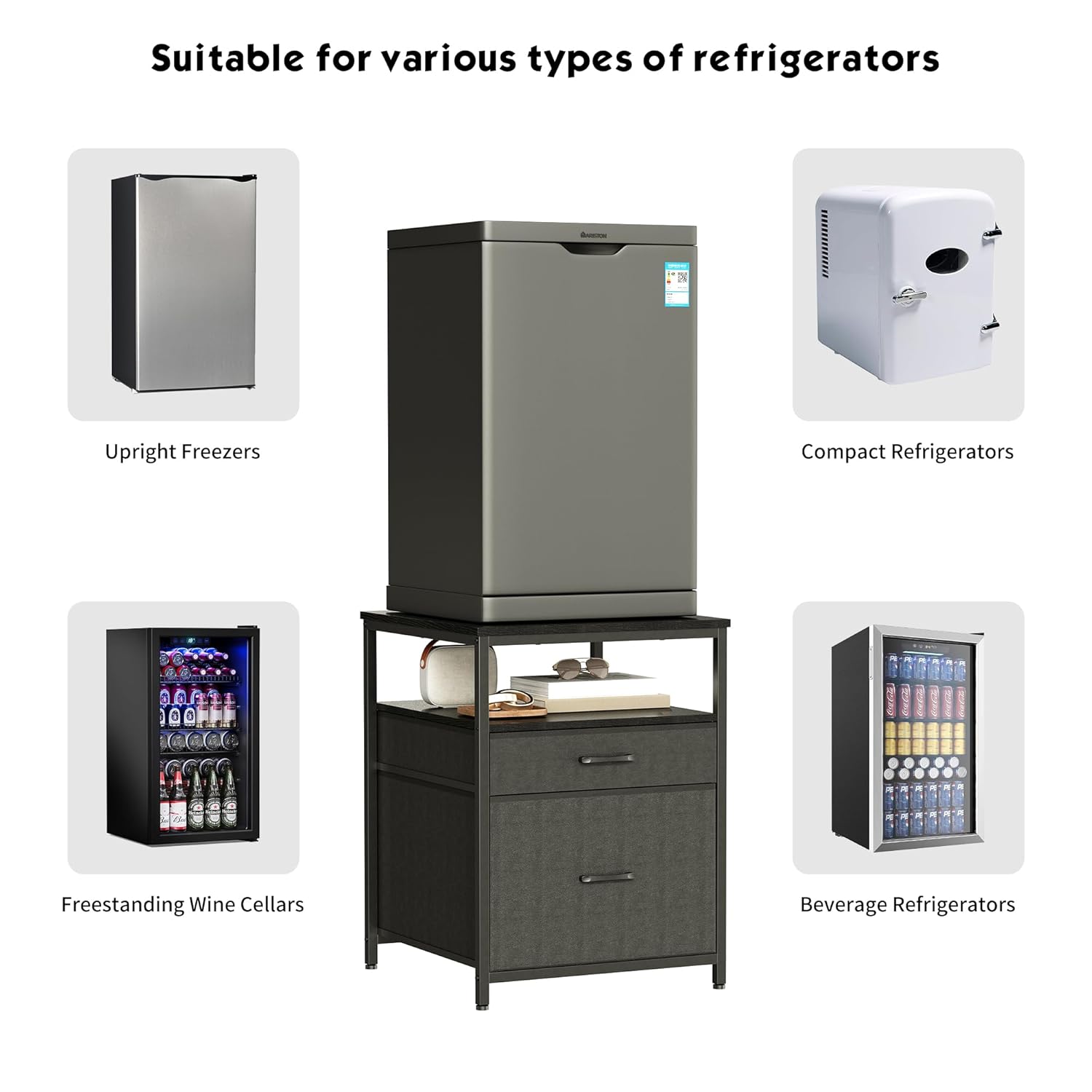 - Three-Tier Storage Design – This mini fridge stand features two fabric drawers (NOT WOOD) and one compartment, offering a total of three storage spaces to perfectly meet your various storage needs. Itโs not just a mini fridge stand with storage; itโs also a great mini fridge organizer, helping you easily keep items around your fridge tidy and organized.