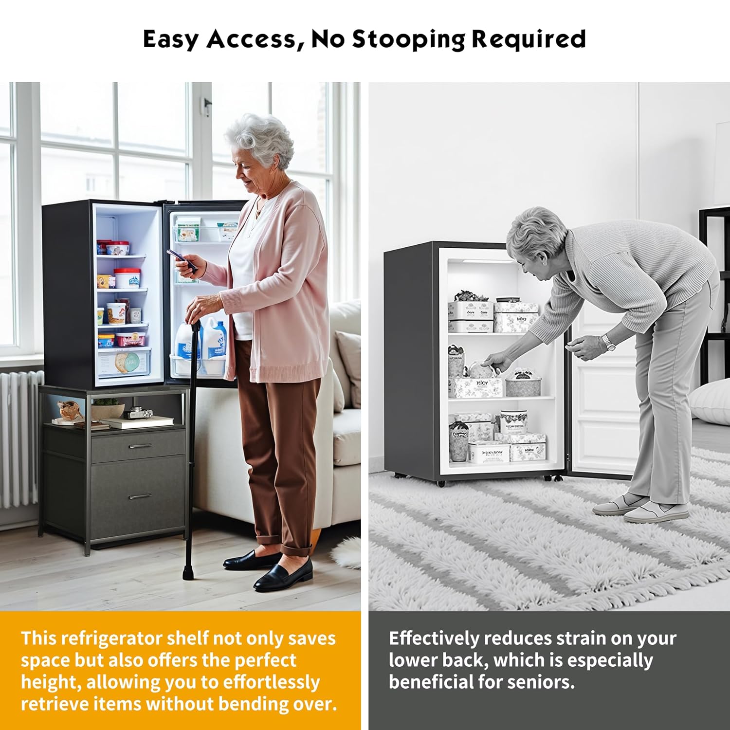 - Grab Items with Ease – This mini fridge stand is designed to reduce strain on your back and lower back, making it especially suitable for seniors. By elevating your fridge, you’ll no longer need to bend over frequently to access items, making everyday use more comfortable and convenient.