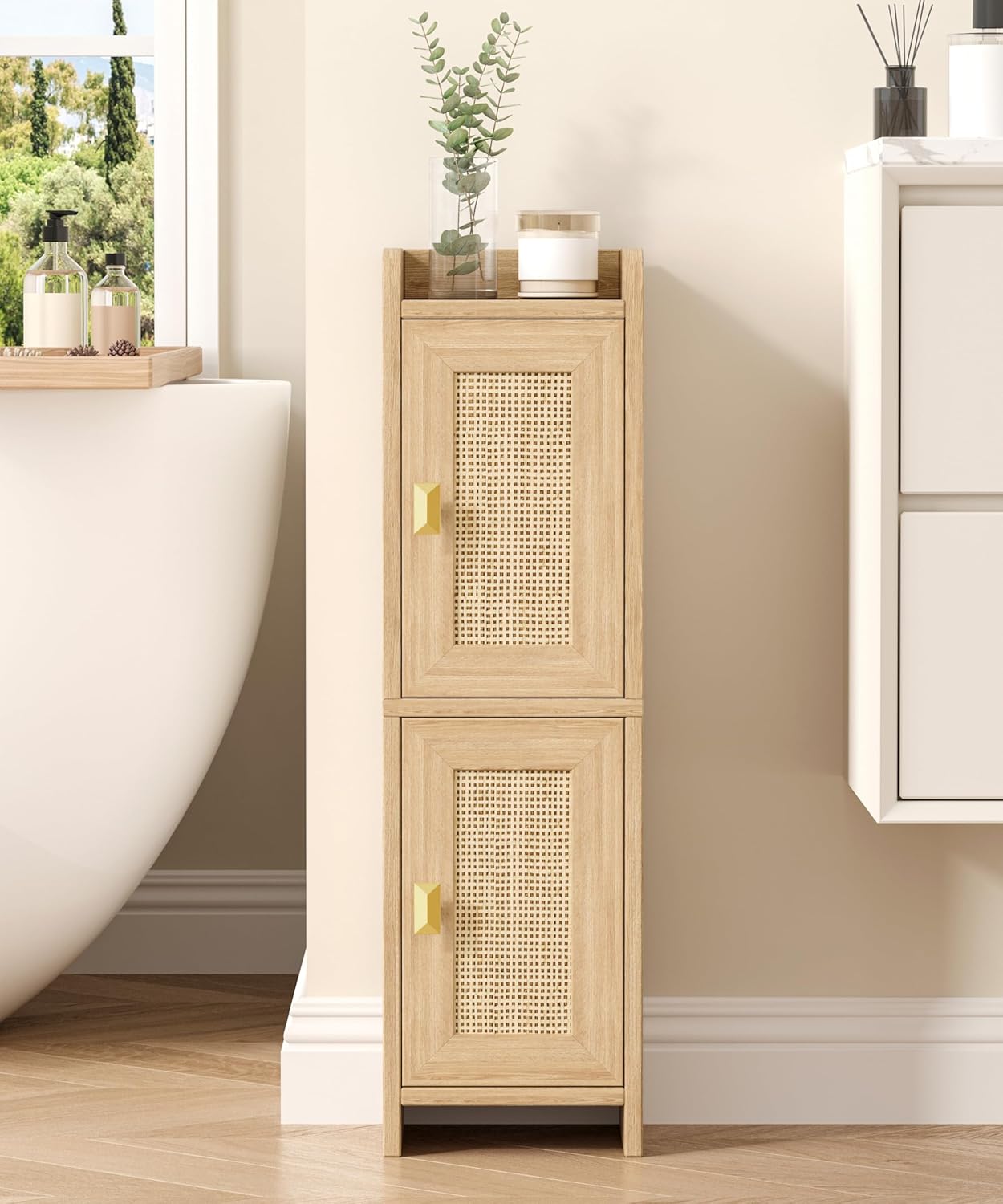Photos: Rattan Small Bathroom Cabinet with 2 Doors, Narrow Toilet Paper Storage Cabinet, Bathroom Organizer for Small Spaces, Wooden Slim Corner Floor Unit with Adjustable Shelves,… by Akxomel