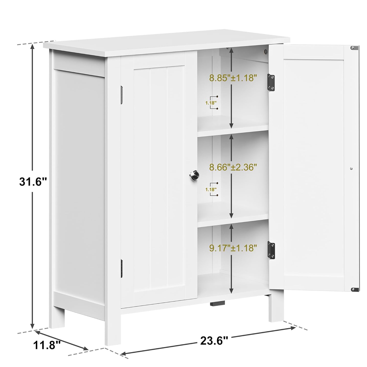 - LARGE STORAGE CAPACITY: Dimension: 23. 6”L*11. 8”W*31. 6”H. 2 interior shelves with 3 adjustable heights meet various storage needs; the closed storage room with 2 doors keeps your stuff away from dust. Three built-in storage cubbies keep your toothbrush, soap, or toiletries at arm’s reach without taking up little floor area