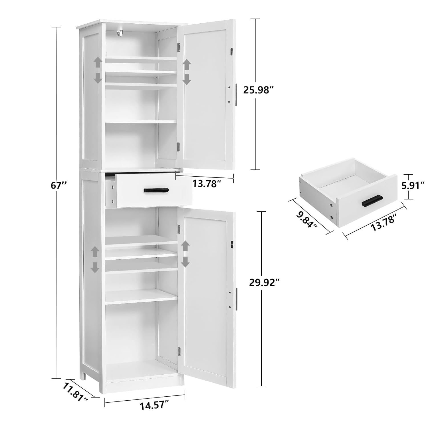 Specification: usikey 67” Tall Bathroom Cabinet, Storage Cabinet with 4 Shelves & 2 Doors, Narrow Storage Cabinets for Bathroom, Living Room, Home Office, White by usikey