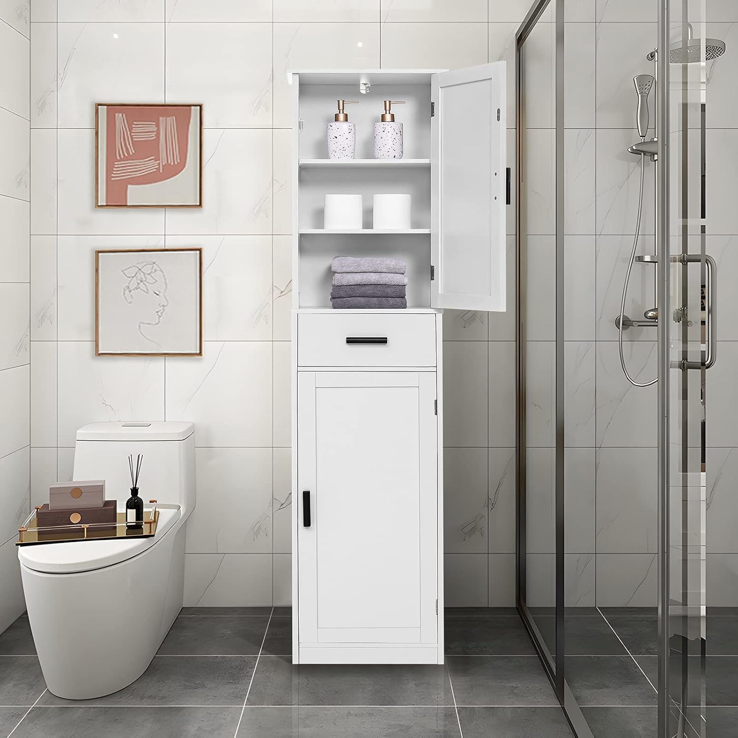 Photos: usikey 67” Tall Bathroom Cabinet, Storage Cabinet with 4 Shelves & 2 Doors, Narrow Storage Cabinets for Bathroom, Living Room, Home Office, White by usikey