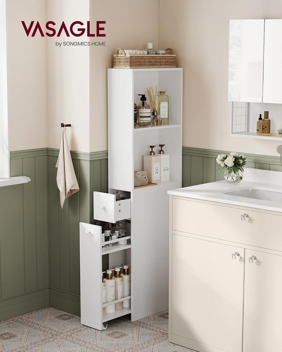3947 reviews for VASAGLE Slim Storage Cabinet, Narrow Freestanding Cabinet with Drawers and Adjustable Shelf, Modern Linen Tower for Living Room Bathroom Bedroom, White UBBK567T14 by VASAGLE