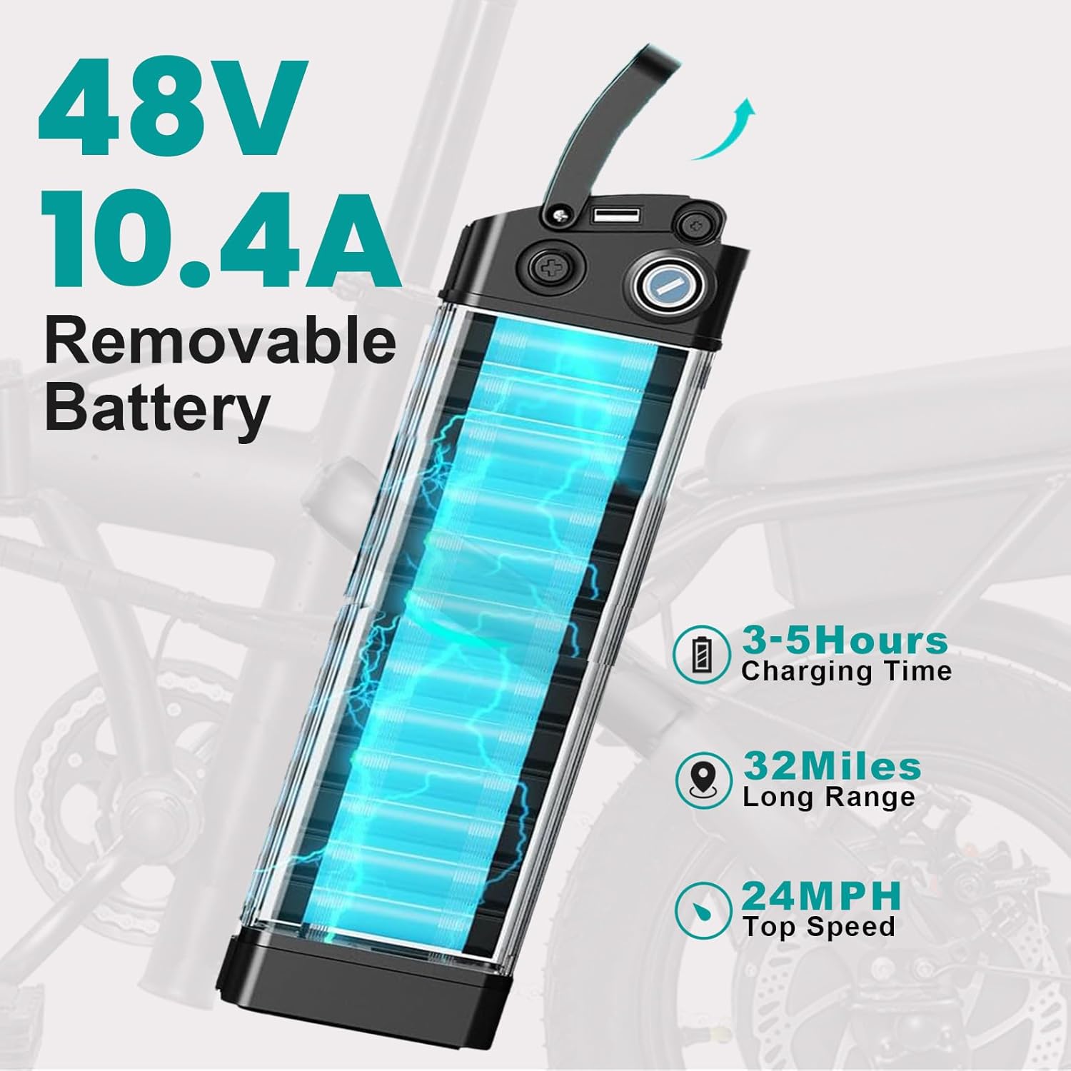 - Removable 48V 10Ah Battery – Featuring a long-lasting 48V 10Ah removable lithium battery, this Electric Bicycle offers extended ride time and convenient charging. Easily detach the battery for indoor charging and enjoy worry-free travel with reliable power.