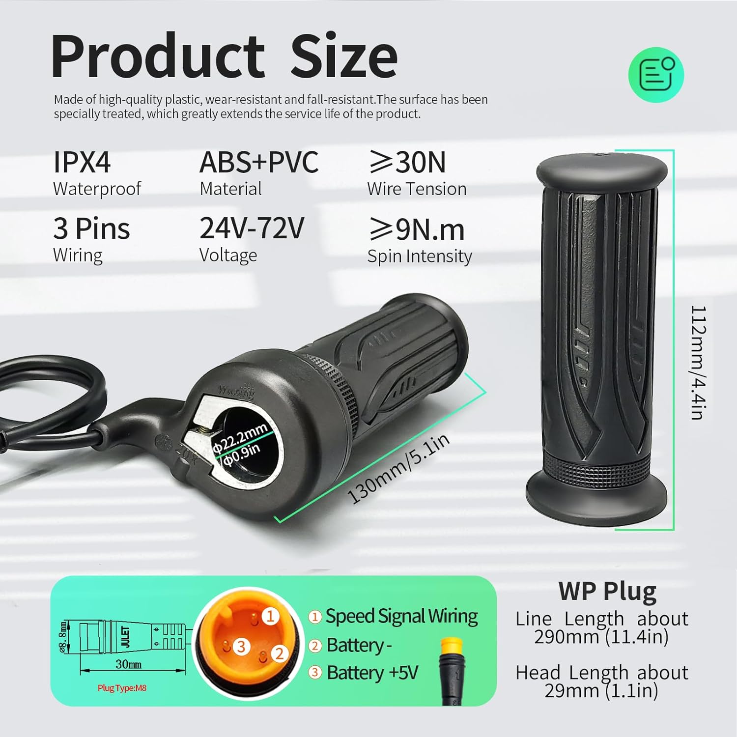 About Electric Bike Full Twist Throttle Right Handle Throttle 24V 36V 48V 60V 72V with 3 pin Waterproof/SM Connector for EBike or Folding Electric Scooter (20X-Full-WP)