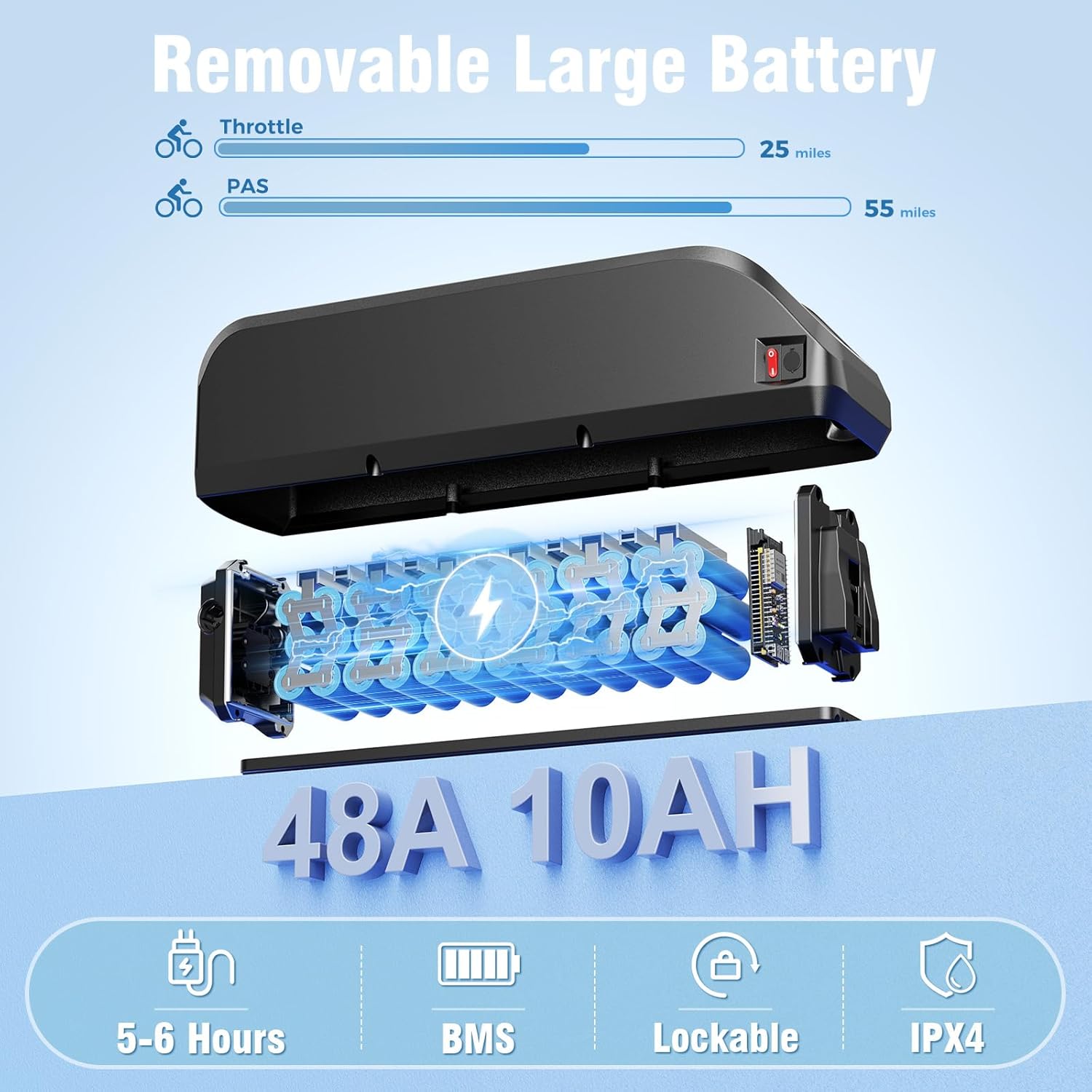 - EXTENDED 50 MILE RANGE & REMOVABLE 480WH BATTERY: Say goodbye to range anxiety. Our high-capacity 480Wh lithium-ion battery delivers an impressive range of up to 50 miles per charge in pedal-assist (PAS) mode, depending on rider weight, terrain, and assist level. Easily detach it for secure, off-bike charging indoors (in just 5-6 hours) or storage. This flexibility makes the e-bike perfect for apartment dwellers, commuters, and anyone prioritizing security and charging ease.