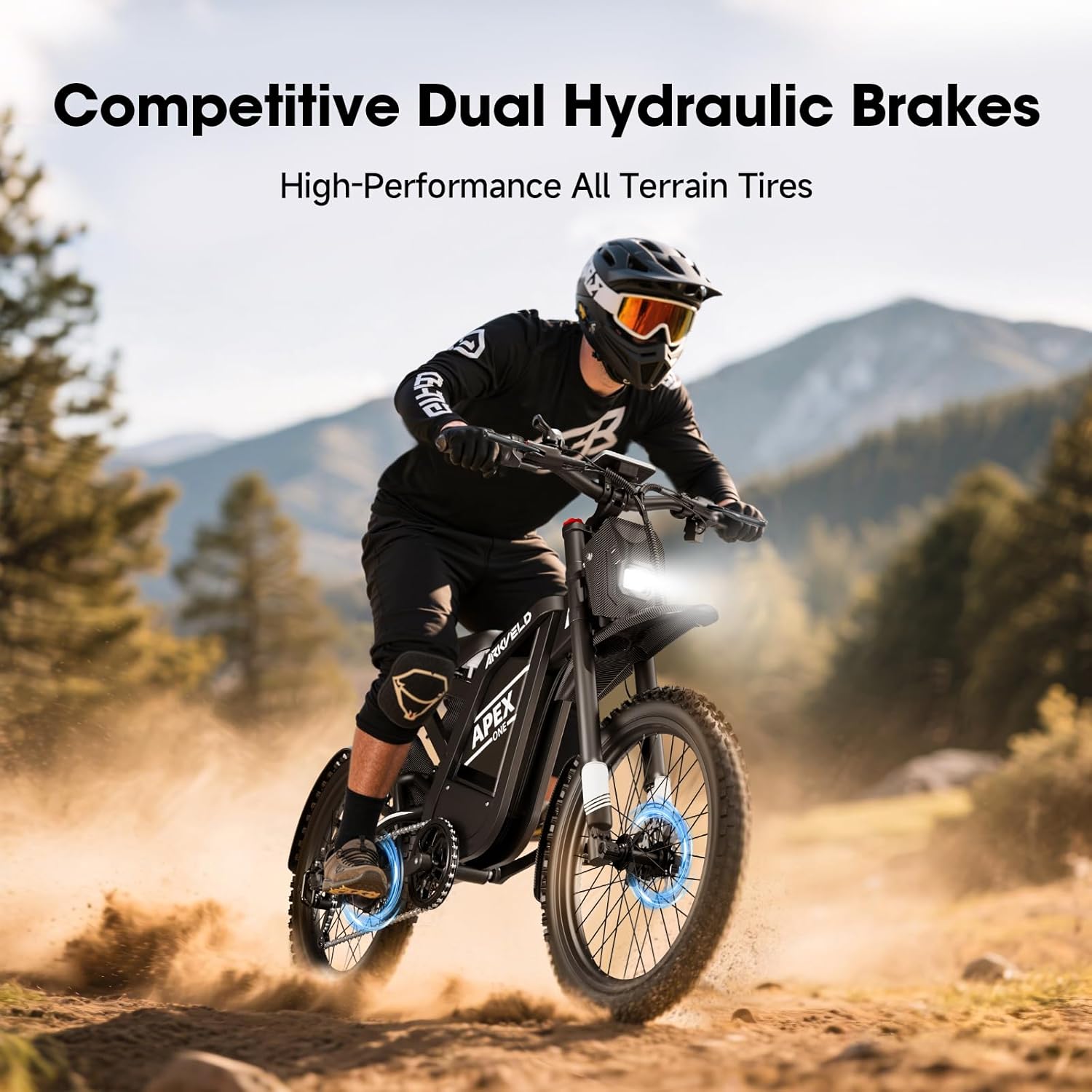 - 【Full Front suspension and hydraulic Dual Brakes】electric dirt bike Smooth ride with 5-level suspension & dual disc brakes. Strong front fork shock absorbers, seat shock absorber, and puncture-resistant 25Inches fat tires. Reliable braking on steep slopes & rugged terrain with front disc brakes, rear hydraulic shock absorber. Hydraulic dual brakes reduce braking distance by 50% even in wet conditions