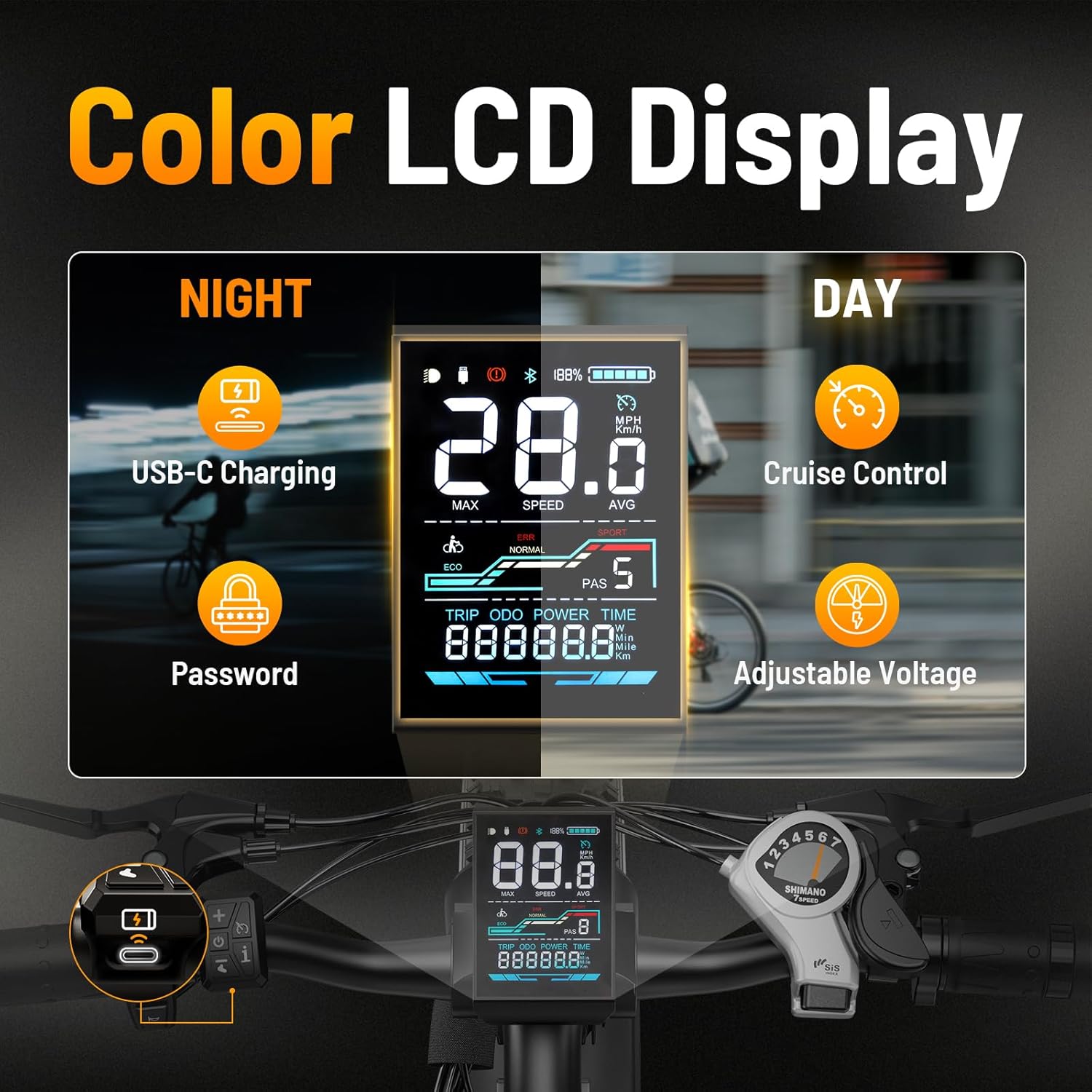 - Enhanced Visibility and Utility: The vibrant color display on this adult electric bicycle offers clarity and convenience, showing real-time stats like speed, mileage, and battery levels,and more at a glance. With built-in cruise control, long-distance rides become effortless, while the password-protected dashboard adds an extra layer of personalized security
