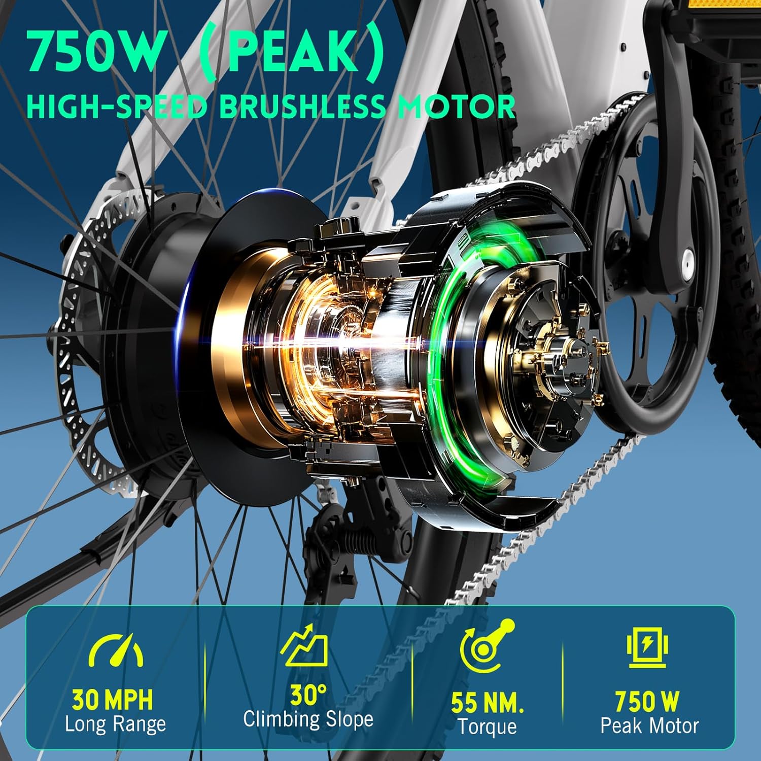 - 750 W BRUSHLESS MOTOR PEAK:The 750 W motor is a key component of the e-bike. This e-bike is equipped with a brushless motor with 750 W peak power and a top speed of up to 30 mph. It is suitable for use on a variety of terrains, including roads, grass, sand and mountains. This city e-bike is ideal for use on weekend trips and for your daily commute, offering a faster and more economical solution.