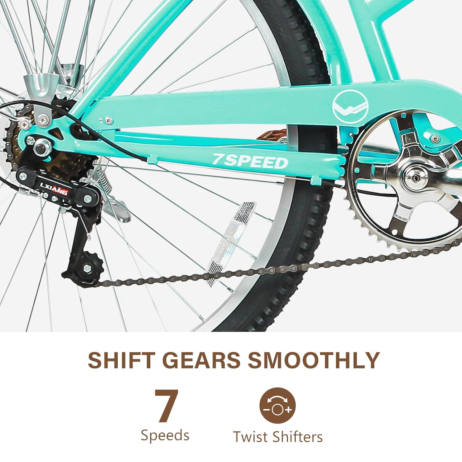 - 【Smooth Shifting】: Equipped with a 7-speed derailleur and user-friendly twist shifters, this Retro Cruiser bike ensures smooth and precise gear changes for stable rides on various terrains, from city streets to winding trails.