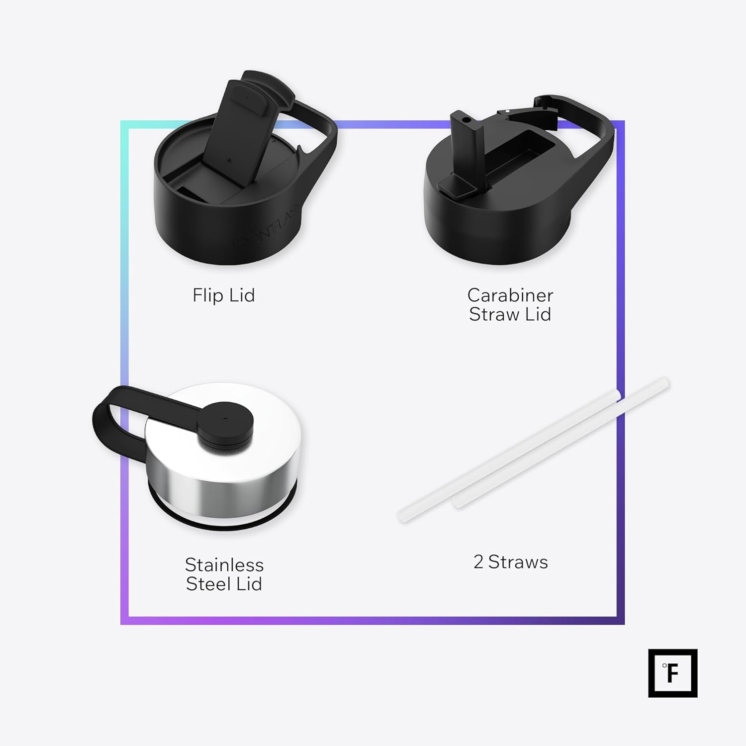 - 3 LIDS: YES, Iron Flask comes with THREE different leakproof lids. Carabiner Straw Lid with 2 Straws, Flip Lid, and a Stainless Steel Lid! *NOTE: The stainless steel lid is plastic from inside and stainless steel from outside*