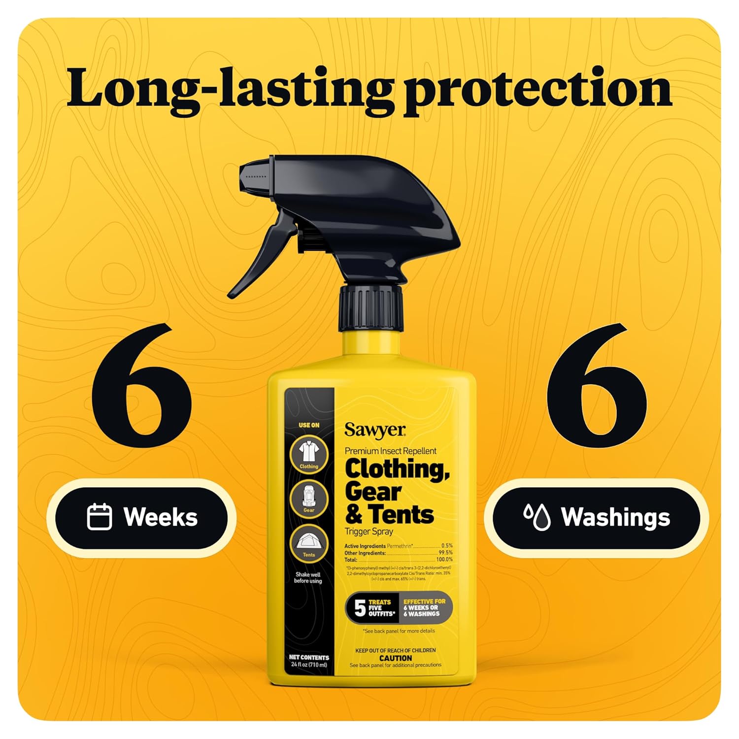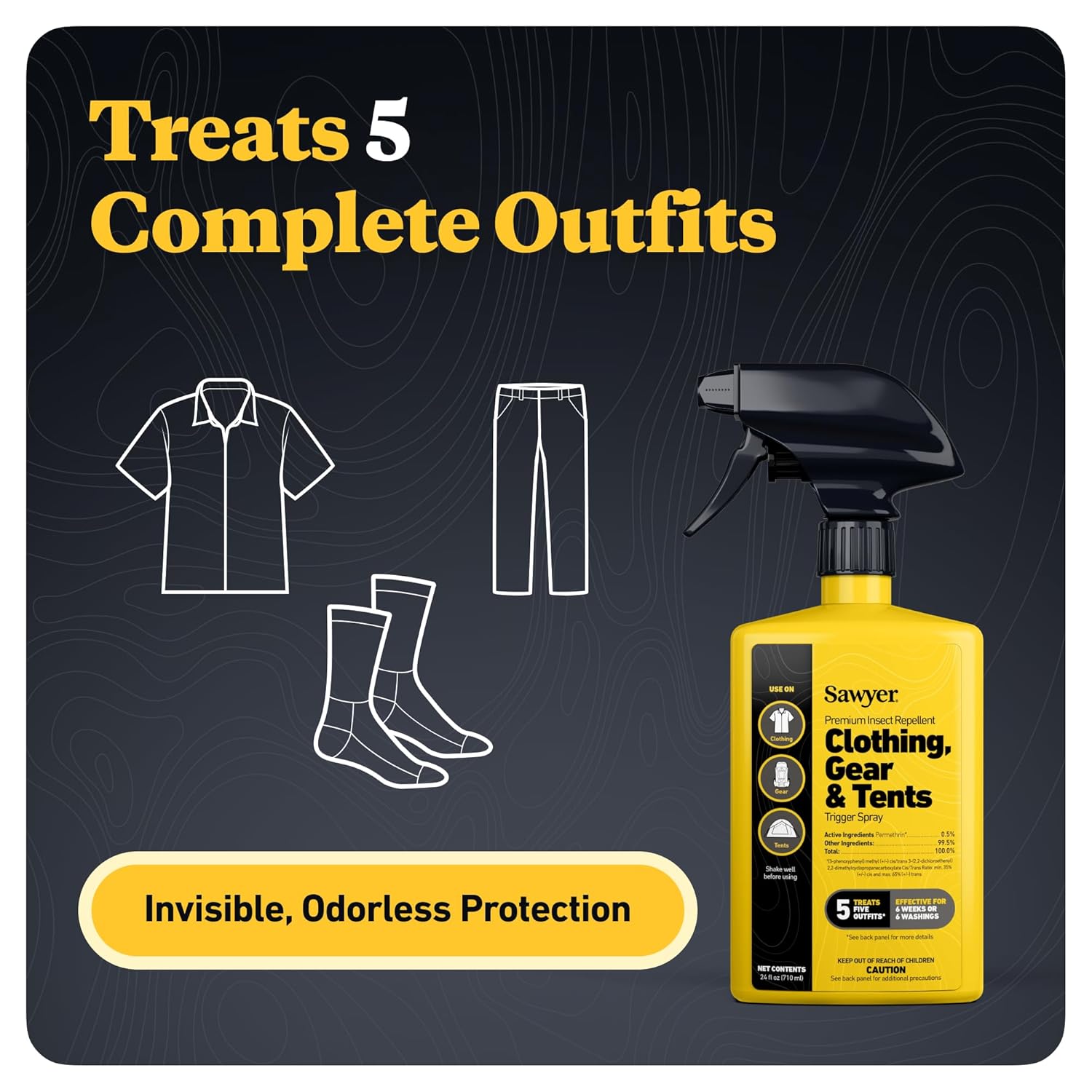 - Sawyer Permethrin stays effective despite sweat or water, degrades via UV exposure or washing machine agitation; Each 18-ounce convenient aerosol spray treats 4 outfits (EPA now reconmends 4.5 ounces per outfit consisting of shirt, pants, and socks)