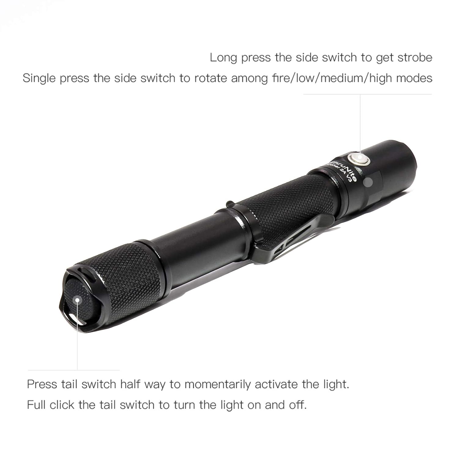 - Tum ON/OFF: Press the tail cap halfway to momentarily ACTIVATE the light.Fully click the tail switch to turn the light on and off. Change Modes: When the light is on, single press the side switch to rotate among Firefly Low Medium High modesLong press the side switch to get Strobe and then single press to end it.
