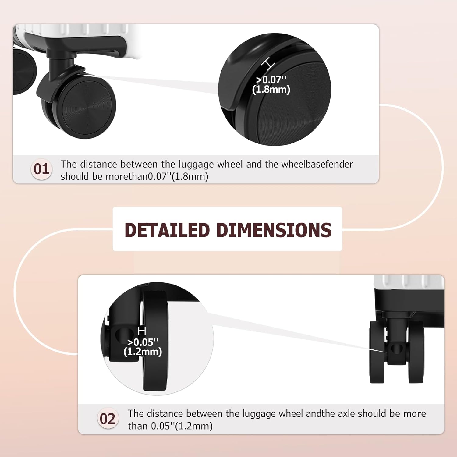 - For 2-2.4in 8 Wheels Suitcase: This Level 8 Luggage Wheel Protector is suitable for suitcases with wheel diameter between 2.0-2.4″(50-60mm),the distance between the luggage wheel and wheel base fender should be more than 0.07″(1.8mm),and the distance between the luggage wheel and axle should be more than 0.05″(1.2mm)