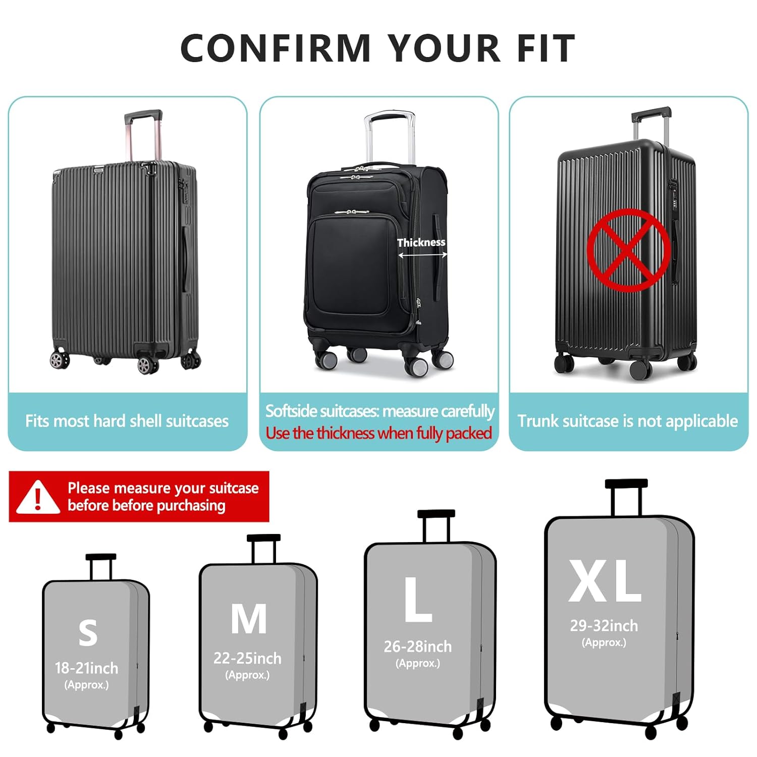 - Be sure to measure your suitcase by the size chart before purchasing. Approximate reference sizes: S roughly fits 18-21 inch suitcases; M roughly fits 22-25 inch suitcases; L roughly fits 26-28 inch suitcases; XL roughly fits 29-32 inch suitcases