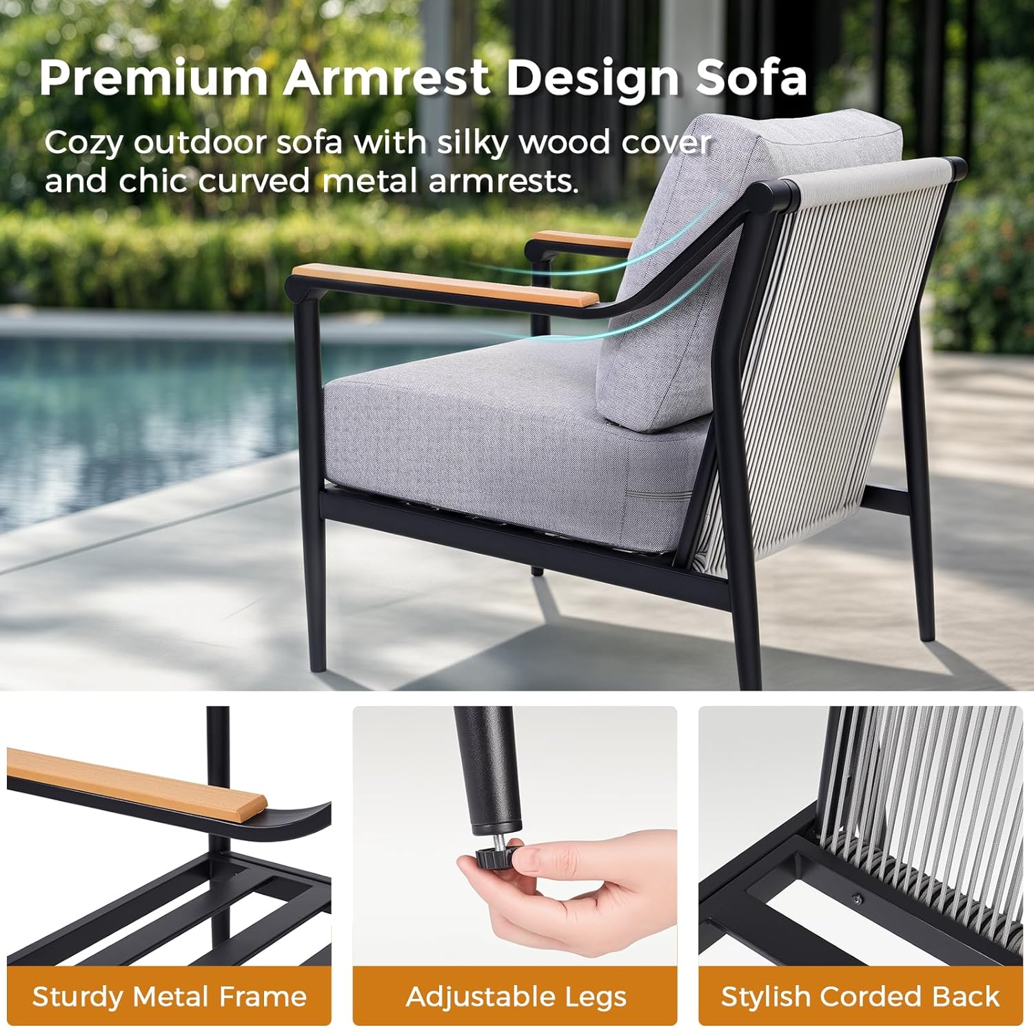 - Long-lasting Elegance: The iron frame is treated with electrophoresis and spray coating, and the armrests feature beautiful wood accents. This combination offers not only durability but also a silky-smooth touch that enhances lounging experiences.