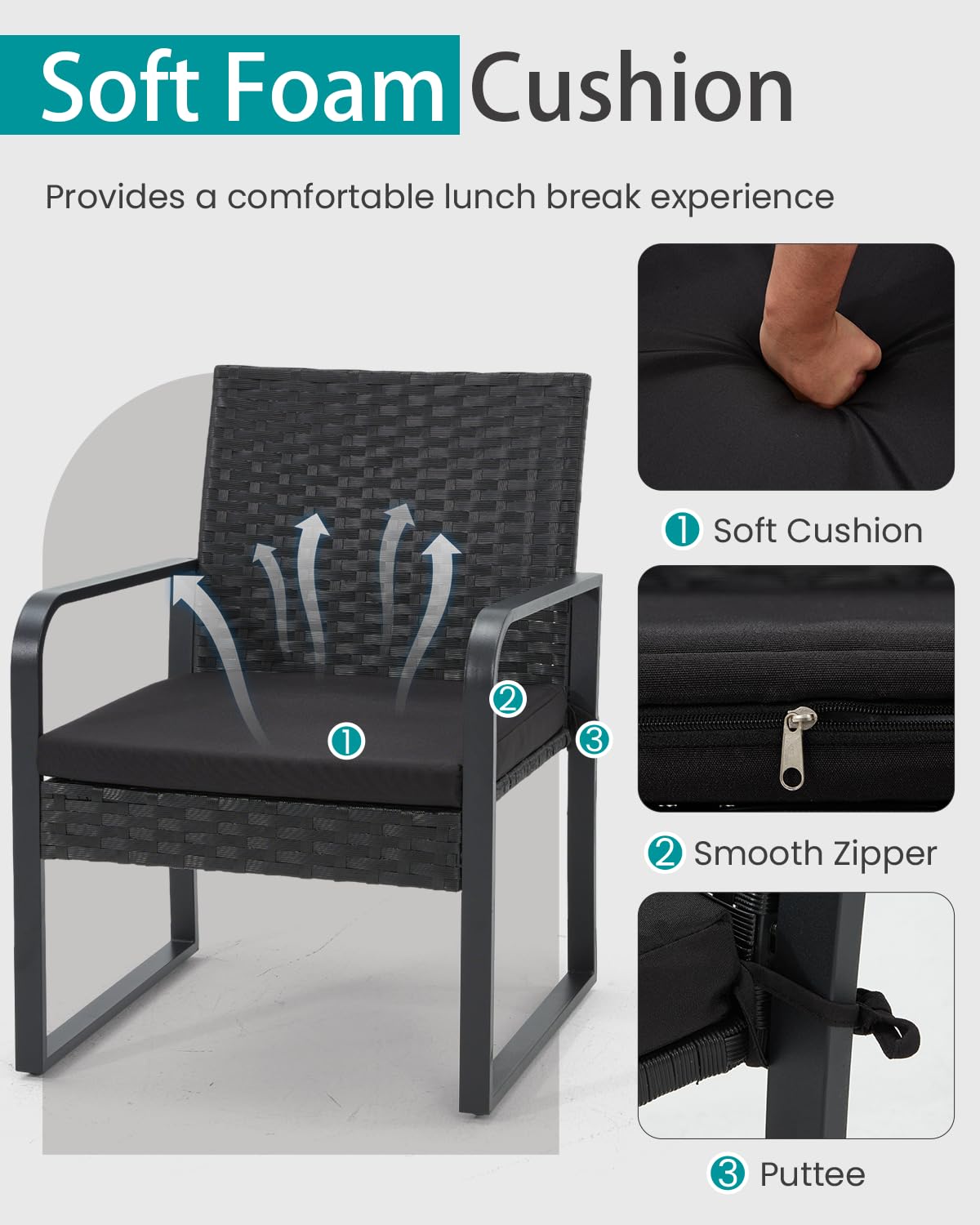 - Comfortable Cushions with Breathable Fabric: The cushions of the outdoor table and chairs are made from high-density foam and soft polyester fabric, offering superior comfort. The cushions are breathable, providing a cozy and enjoyable seating experience for you and your guests during long conversations or relaxation