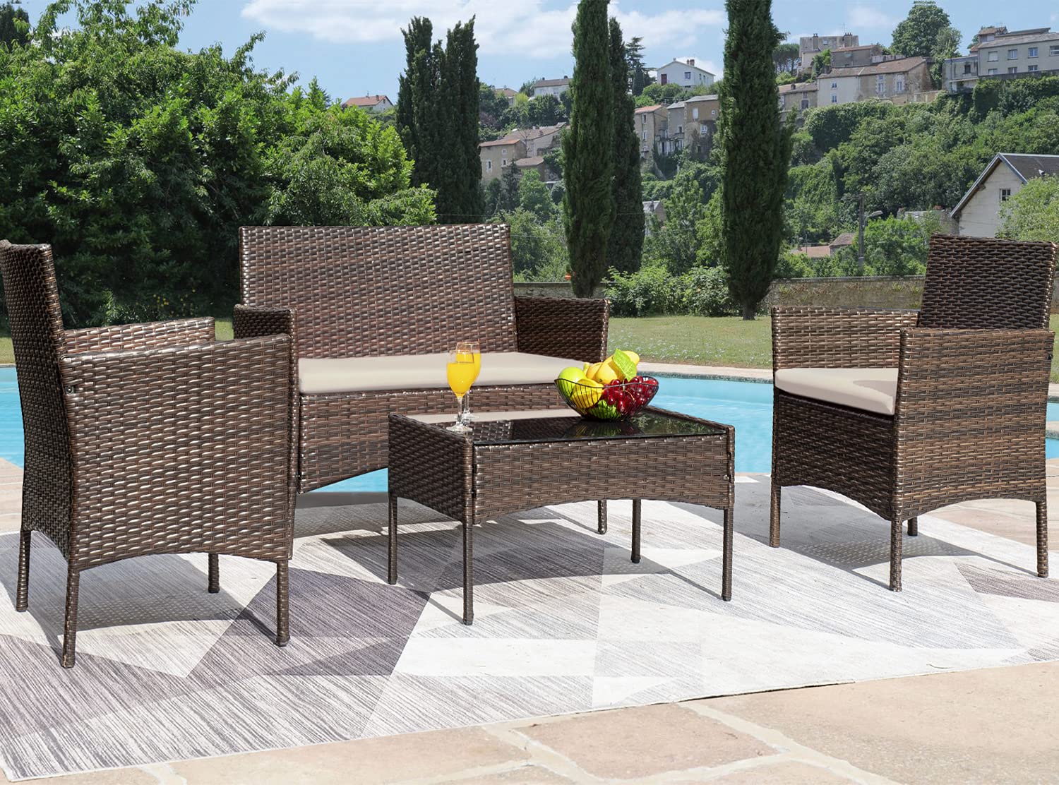 Customer Favorite — discover the Greesum Patio Furniture 4 Pieces Conversation Sets Outdoor Wicker Rattan Chairs Garden Backyard Balcony Porch Poolside loveseat with Soft Cushion and Glass Table, Brown and Beige by Greesum, built for performance and designed for life in the United States.