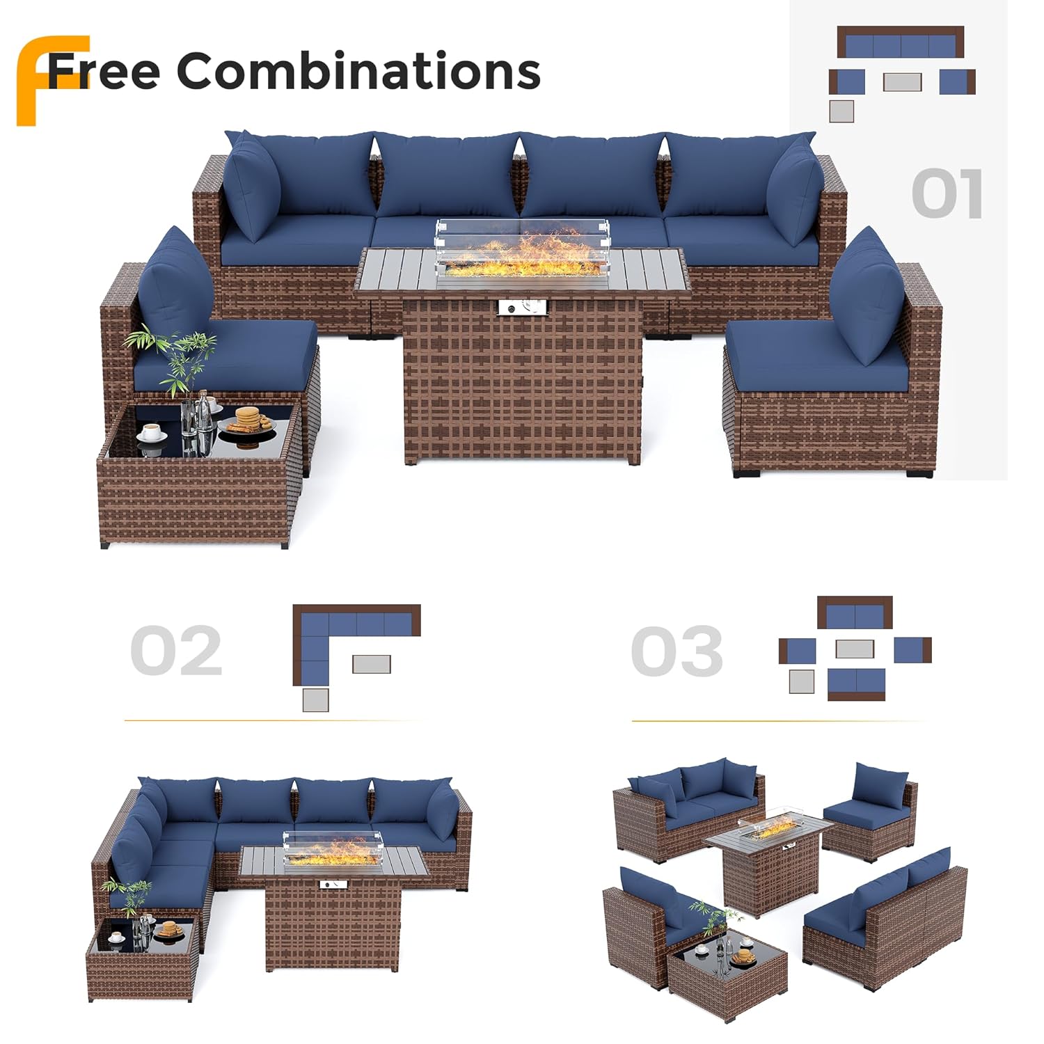 About UDPATIO Outdoor Patio Furniture Set with Fire Pit Table, 8 Piece Outdoor Sectional Sofas, All-Weather Wicker Patio Conversation Set for Garden, Backyard Navy Blue
