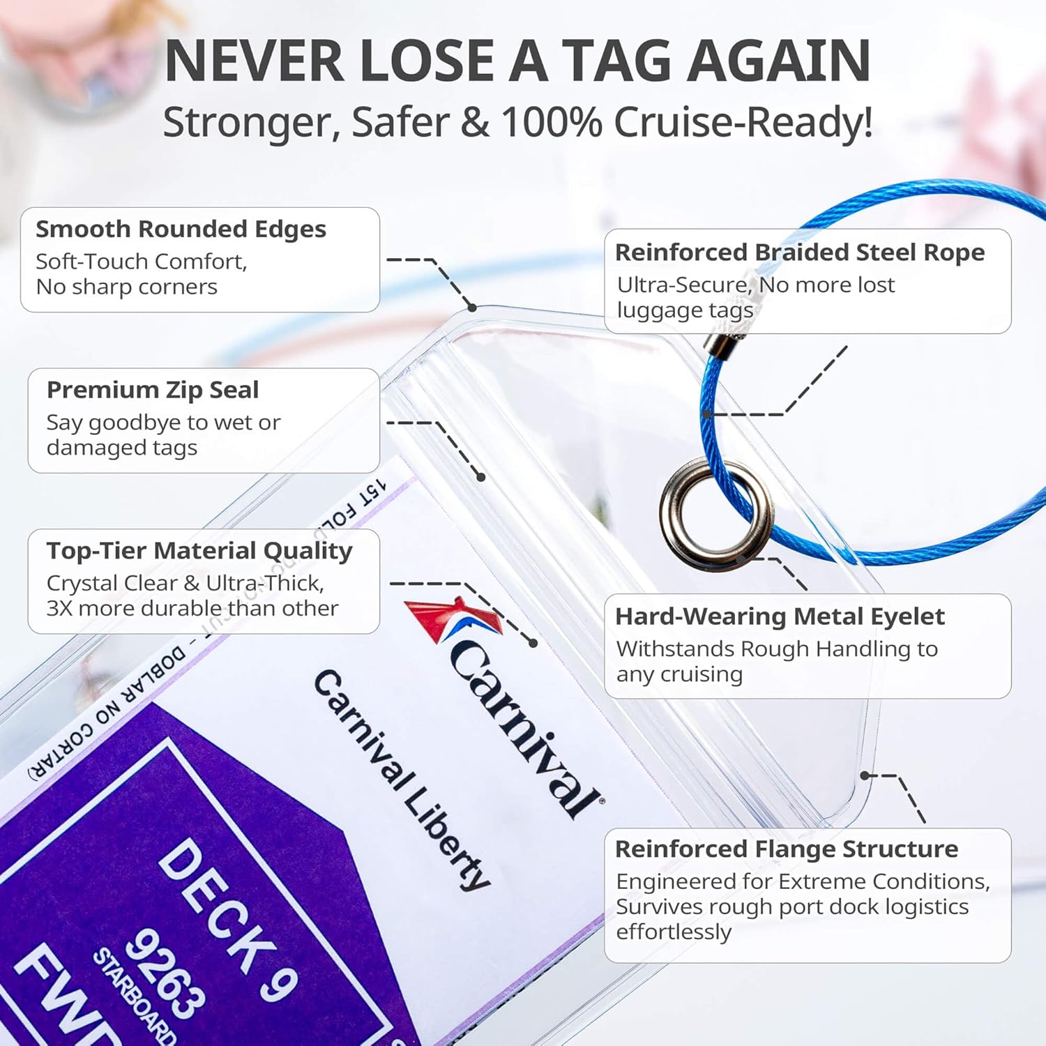 - NEVER GET LOST: Cruise luggage tag holder have Secure metal eyelet and Sturdy nylon coated braided steel loop, handling tough weather with ease, never worry your cruise essentials ripped or lost
