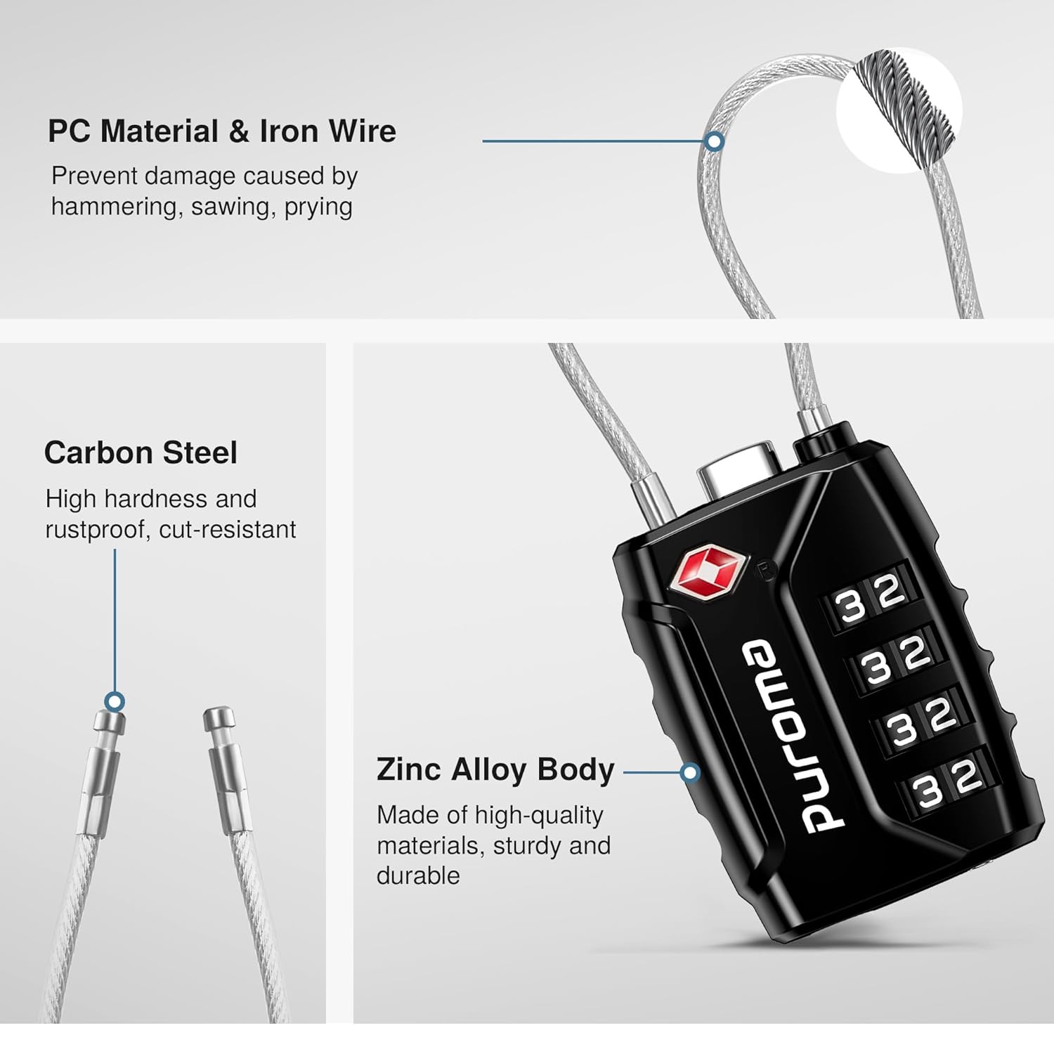 About Puroma 2 Pack TSA Approved Luggage Locks, 4 Digit Combination Travel Locks Resettable Code Lock with Zinc Alloy Body for Suitcase, Toolbox, Backpack, Bag, Gym Locker (Black)