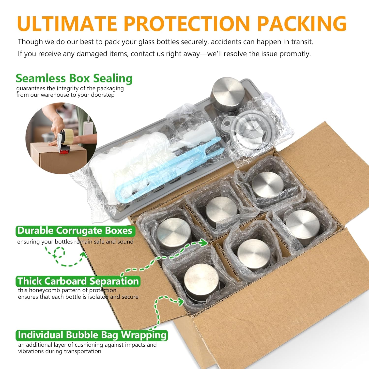 - AIRTIGHT AND LEAK PROOF: Juicing Kit Bundle includes : 6 pack clear 18 oz Zukro glass juice bottles with airtight lids, a bottle cleaning brush for easy hand washing, a funnel helps you pour liquids inside the glass containers, an ice stick tray makes long and narrow ice cubes for adding ice easily, extra 1pc stainless steel airtight lids to ensure that the reusable glass bottles always remain sealed. Get our juicing bottles in bulk packs as gift for your whole family and friends.