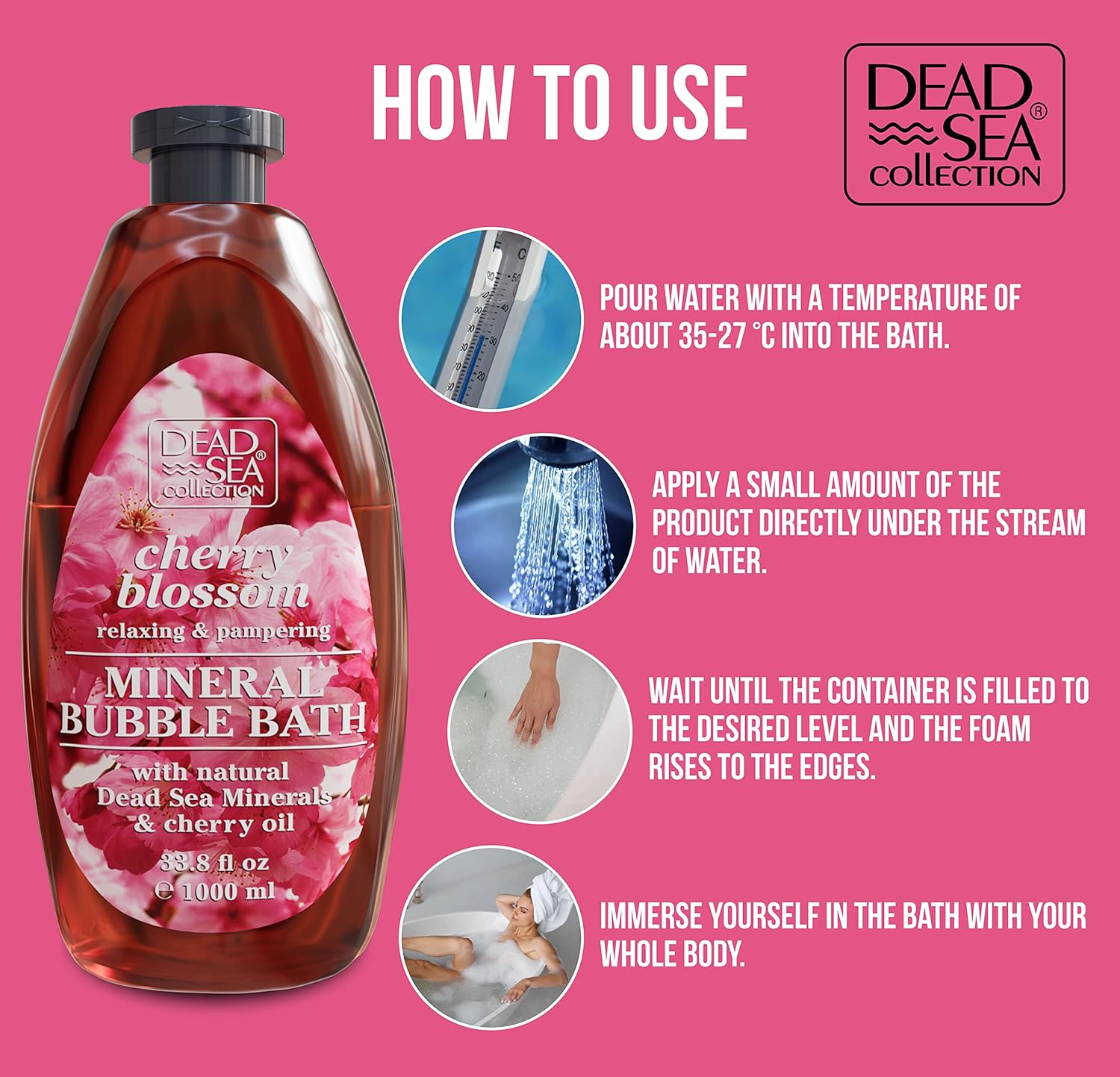 About Dead Sea Collection Bubble Bath with Cherry Blossom for Women and Men – Cherry Seeds Oil and Dead Sea Salt – Nourishing and Moisturizing Skin – Pack of 2 (67.6 fl.oz)