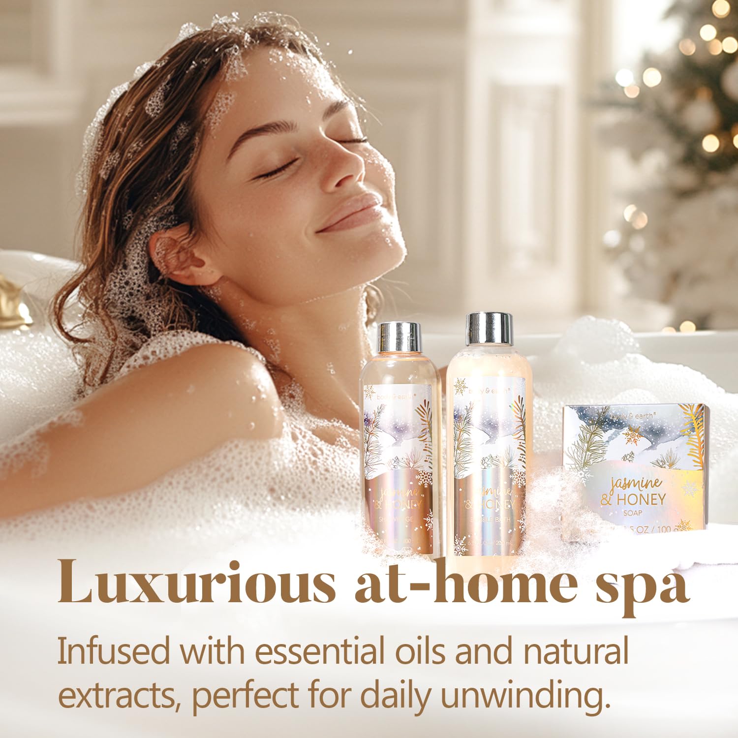 - Perfect Gift Basket for Everyone: Jasmine & Honey scent spa set is designed to nourish skin while relaxing your mind; This bath and body set makes the perfect gifts for every woman