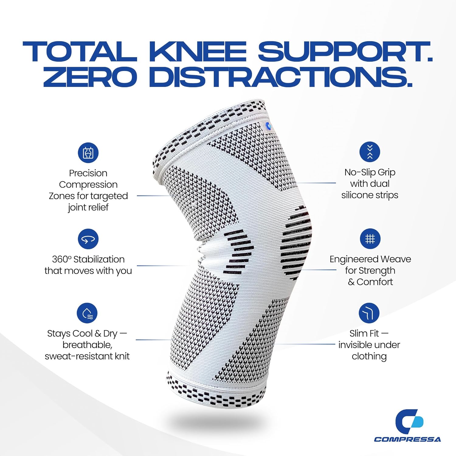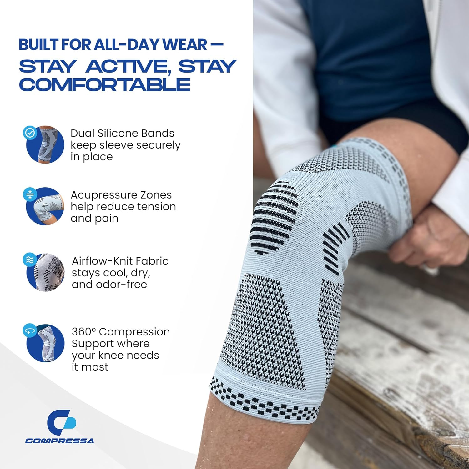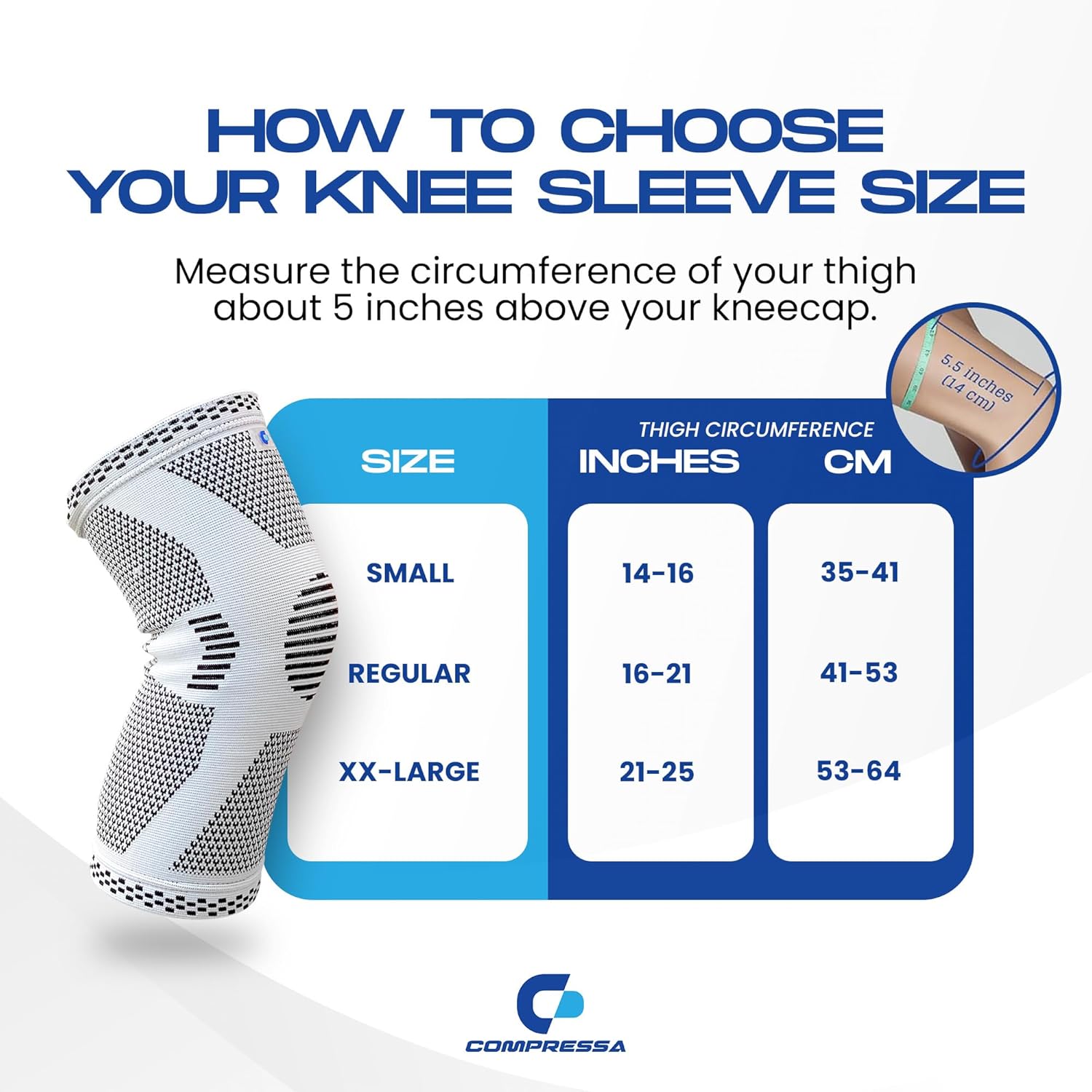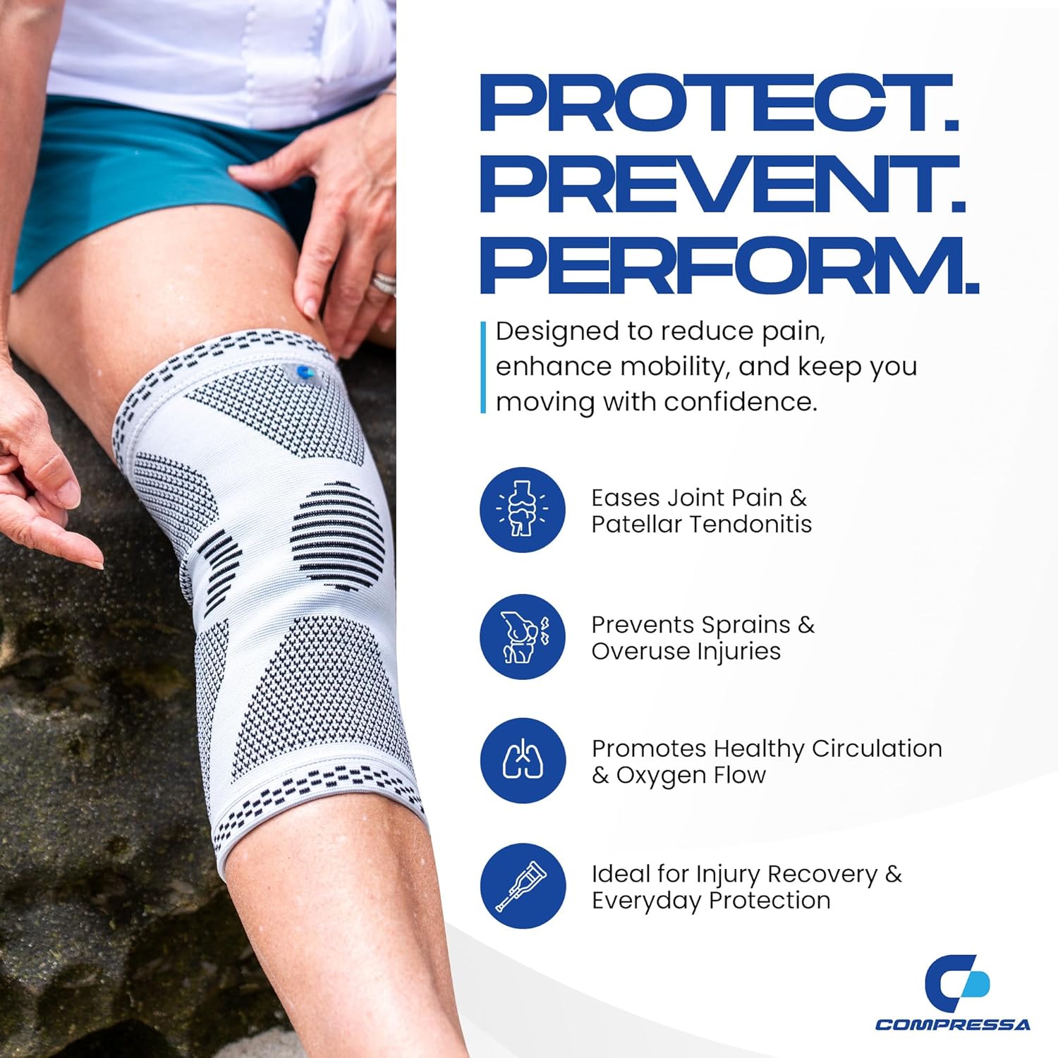 - #1 RATED PREMIUM KNEE COMPRESSION SLEEVE IN THE USA: Recover quickly from joint pain, sprains, and patellar tendonitis with Compressa’s top-rated knee sleeves for men. Engineered for high-quality compression and exceptional comfort, this compression knee brace for women is ideal for accelerating recovery from both acute and chronic injuries. Trusted across the USA, Compressa provides superior support to help you heal faster and return to your daily activities with ease.