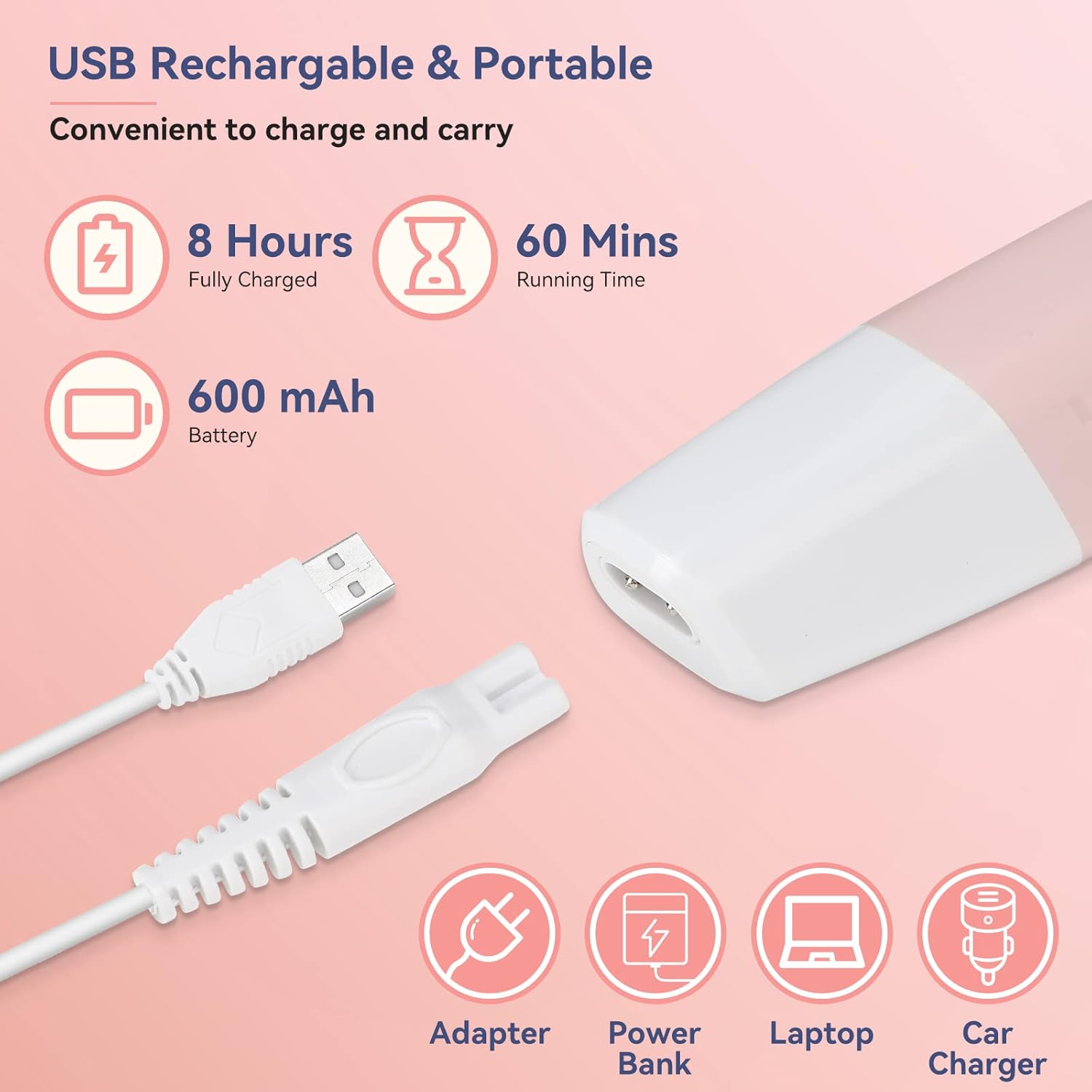 - 【USB Rechargeable & Anti-slip】Trimmer for women comes with a USB cable, which can be connected to any USB device like power bank, computer, laptop and socket. After about 8 hours of charging, the shaving time is about 90 minutes. Perfect for every businesswomen and travelers. The body of this face shaver adopts a non-slip ergonomic design with modern appearance, which has both a sense of grip and beauty.