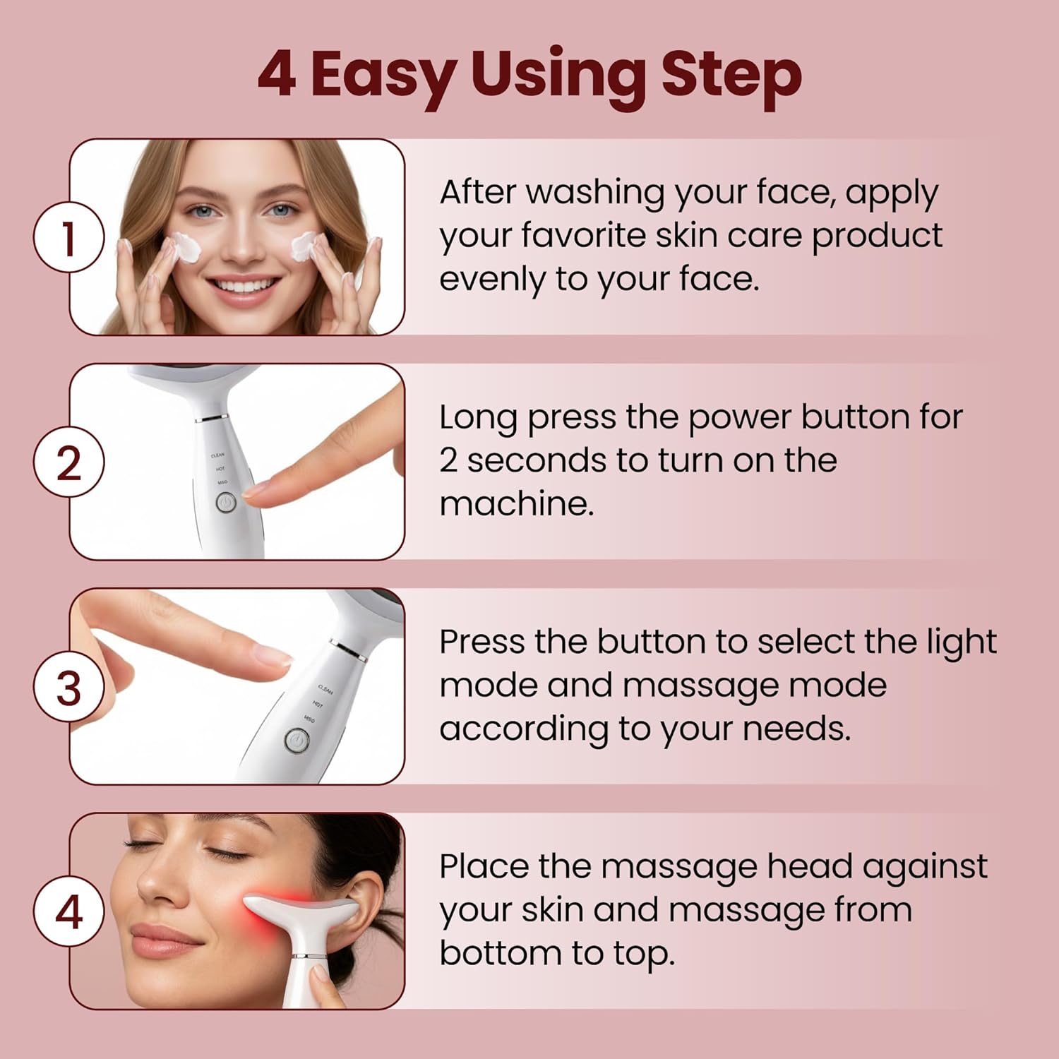 - 【 EASY-TO-USE FOR A RELAXING SKINCARE ROUTINE】 Start by cleansing your face and applying your favorite skincare product. Power on the device, select your preferred mode, and gently glide it across your face and neck. The massager automatically activates upon contact, offering gentle vibrations and warmth. Use daily for 5–10 minutes to elevate your self-care ritual.