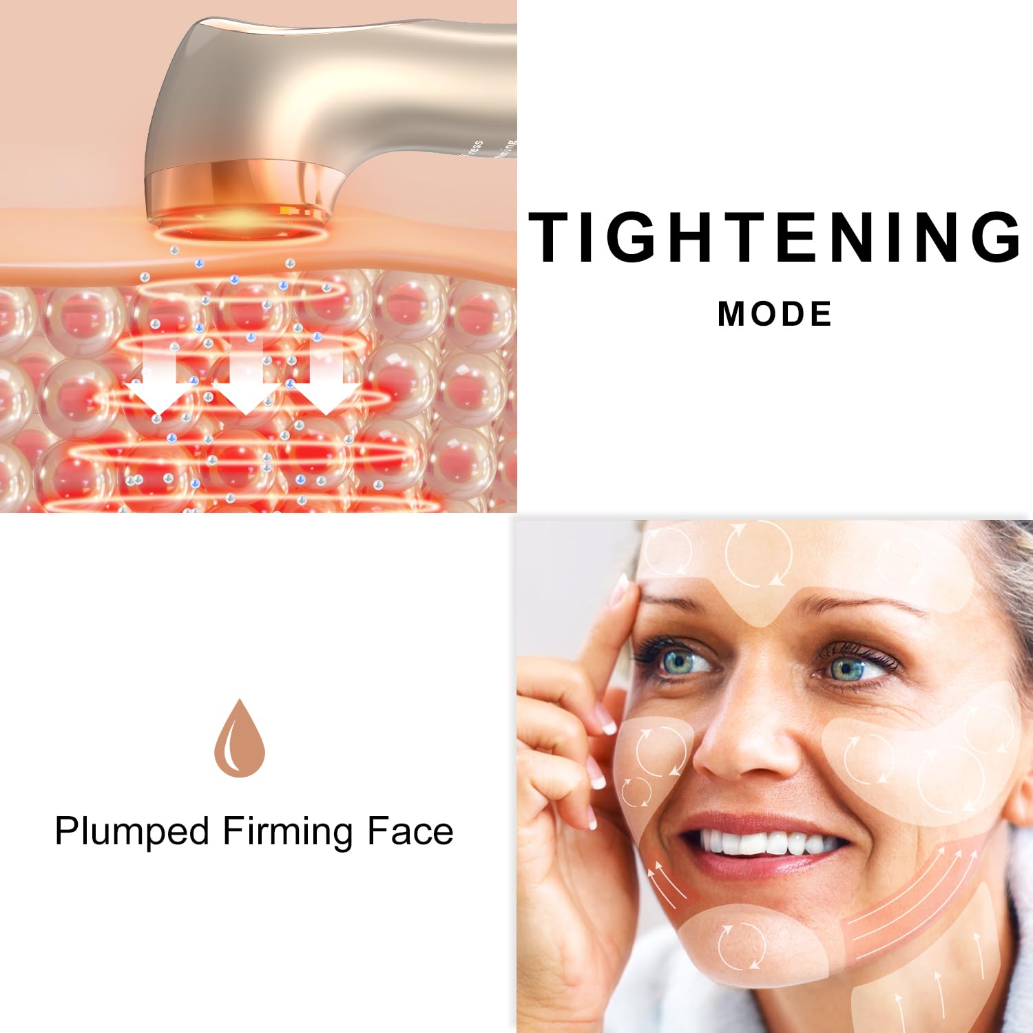 - Radio Frequency for Visible Skin Tightening: Utilize the Tightening mode to benefit from gentle heat and red light technology. This effectively stimulates collagen production, tightens sagging skin, and visibly reduces the appearance of wrinkles and fine lines, helping you regain a smoother complexion.