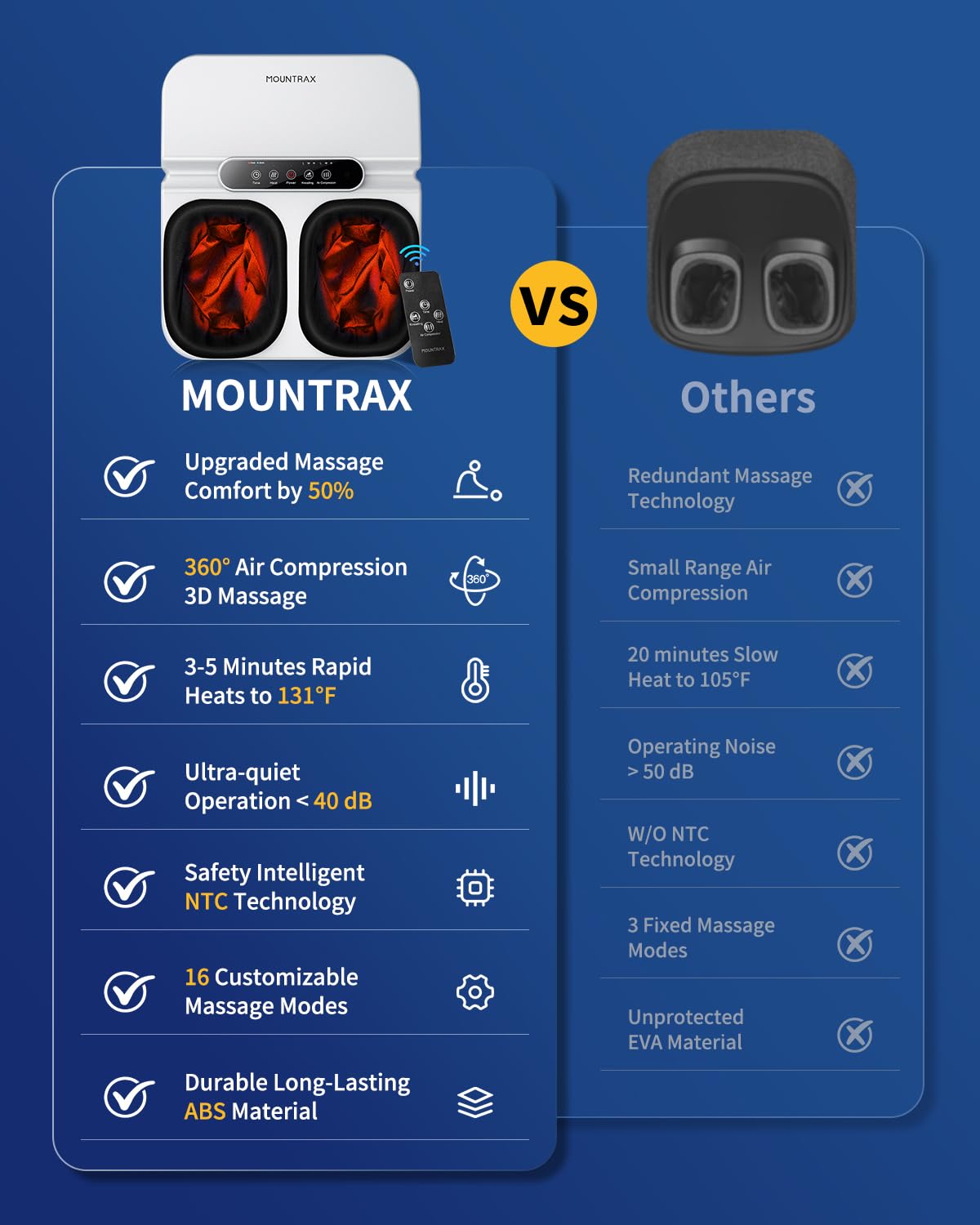 - MOUNTRAX Foot Massager with Heat – Features dual independent rolling heads and 6 groups of ergonomic nodes that precisely target reflex areas (arch, heel, and forefoot), delivering deep tissue pain relief for plantar fasciitis and neuropathy. 15-30 min/day to improve circulation and enhance foot health