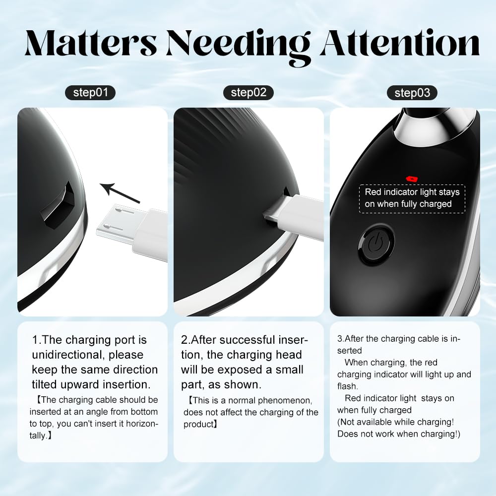- 【Warm tips】1. The product can not be turned on and work when charging. 2. Avoid water inside the product during use and storage. 3. The charging cable is at the bottom of the plastic box in which the product is stored.
