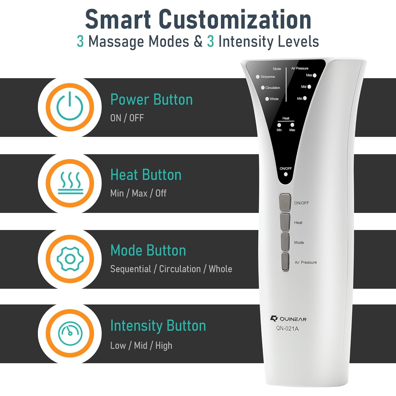 3. Multiple Modes & Intensity Levels: The QUINEAR Leg Massager offers several modes and adjustable intensity levels, which makes it customizable for different needs. You can choose from settings that focus on either a lighter, more relaxing massage or a firmer, more invigorating one. This flexibility allows you to tailor the massage experience to suit your preferences and specific muscle needs.