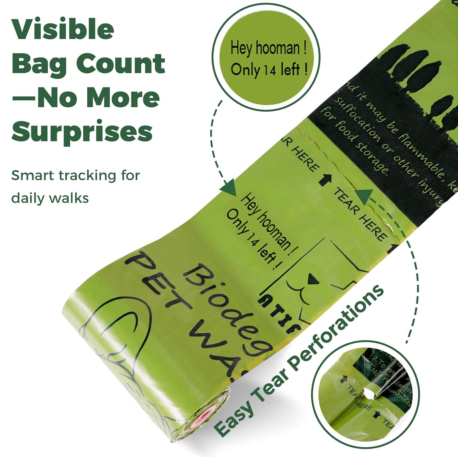 These are hands down the best dog poop bags I’ve come across. The material is strong but not overly thick, and the bags don’t tear or leak. The labeling is clear, so it’s easy to separate them even in a hurry. I’m already on my second order and plan to stick with this brand going forward. Love that they’re biodegradable too — great for the environment and super reliable. Highly recommended for any dog owner.